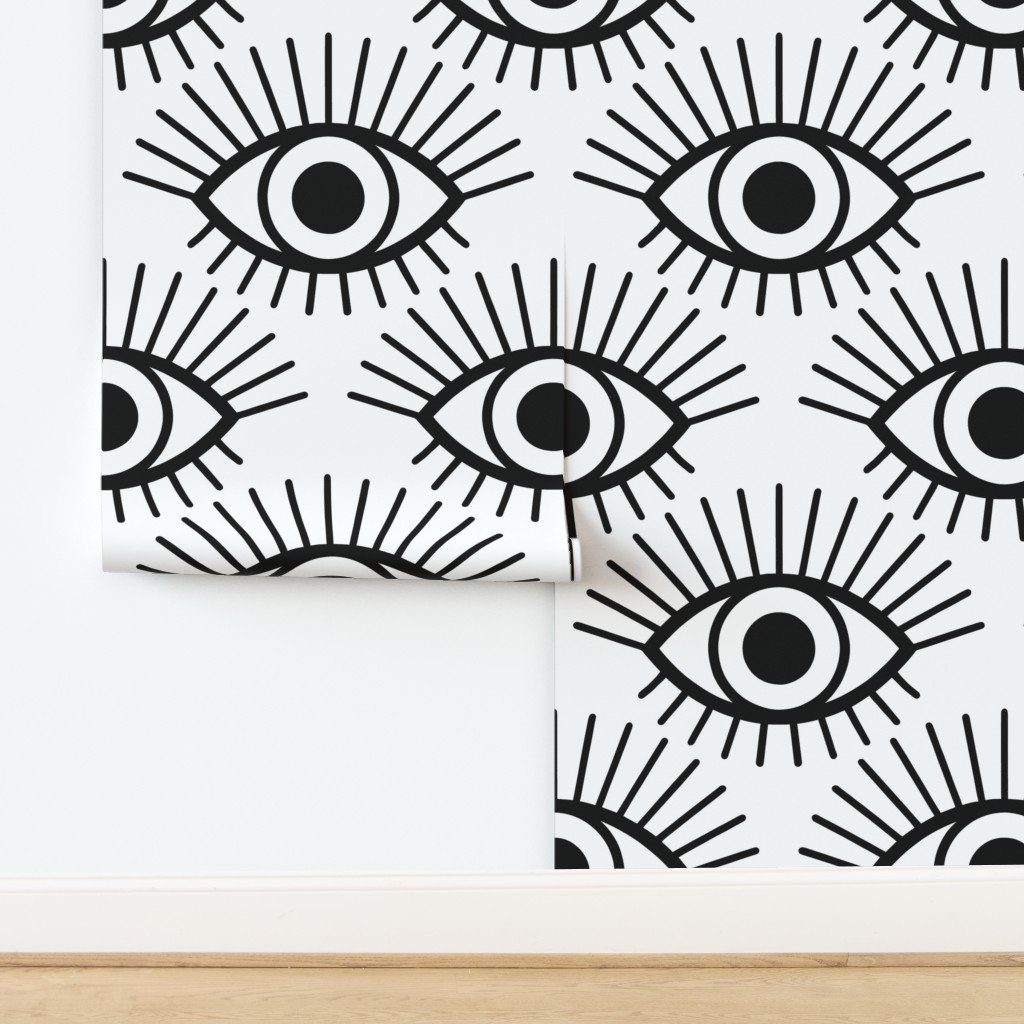 A bold repeat of mystical eye symbols in classic black and white for a striking, sacred look.