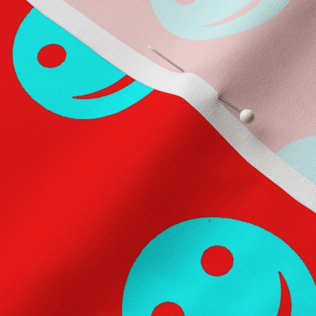 A vibrant pattern featuring neon aqua smiley faces set against a bold red background.