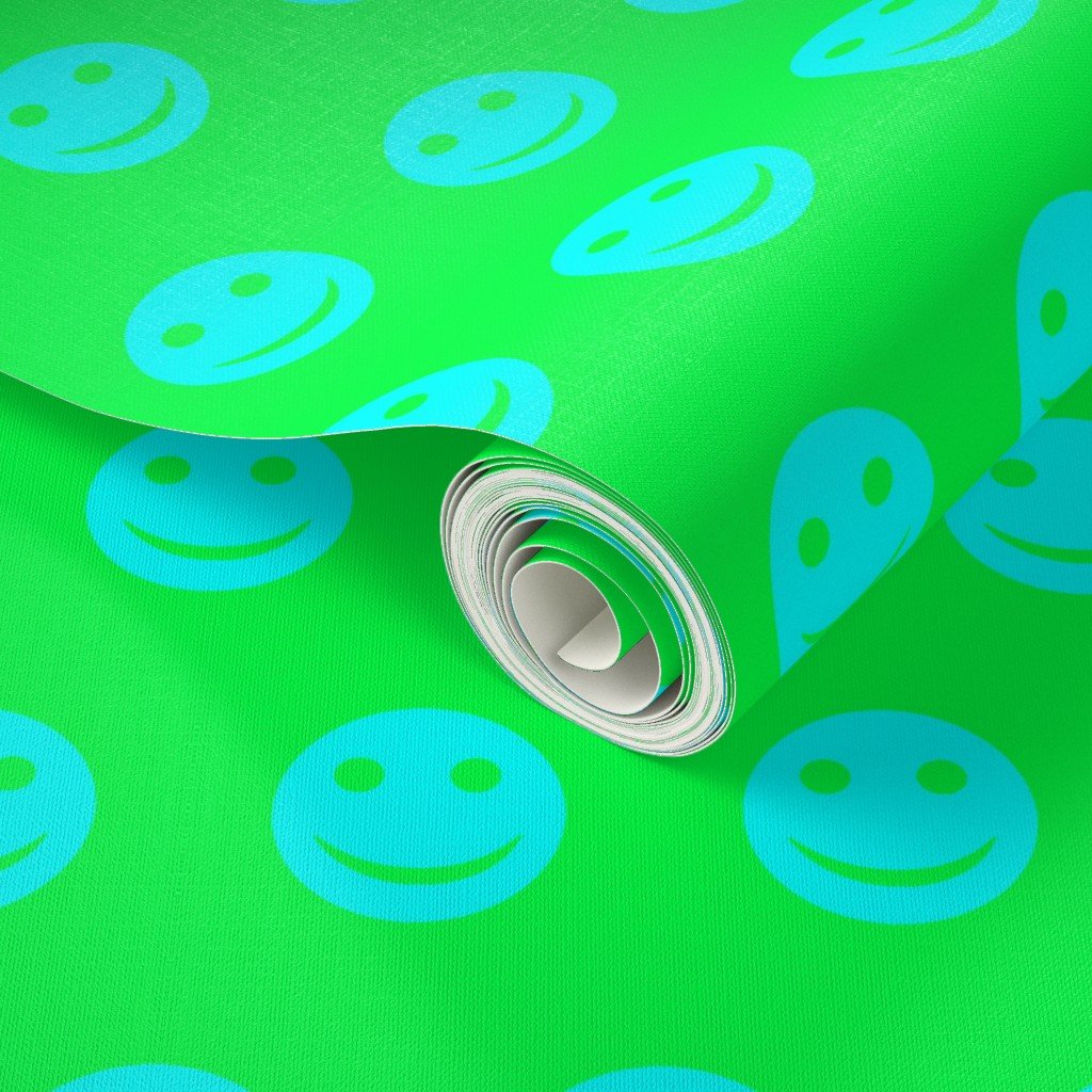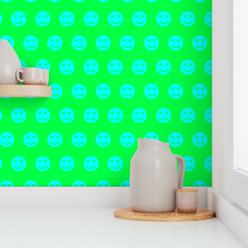 A vibrant and playful pattern featuring neon aqua smiley faces set against a bright green background.