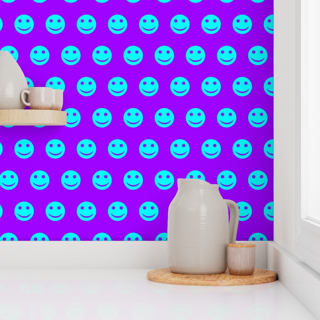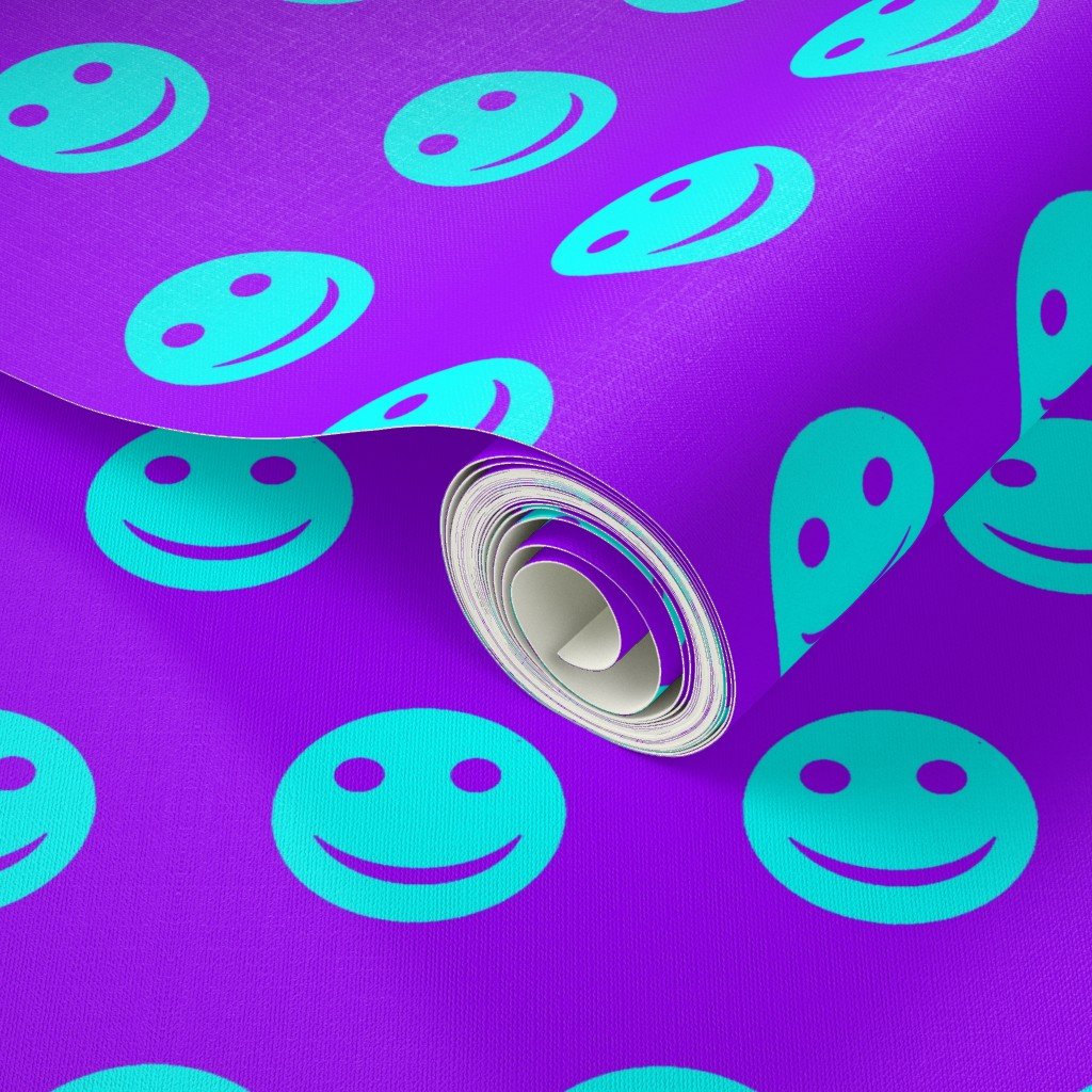 A vibrant and energetic pattern featuring neon aqua smiley faces set against a bright purple background.