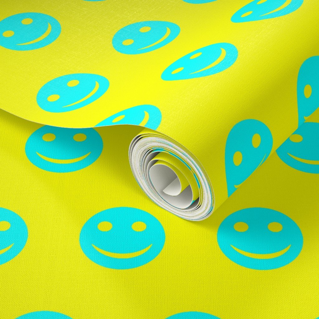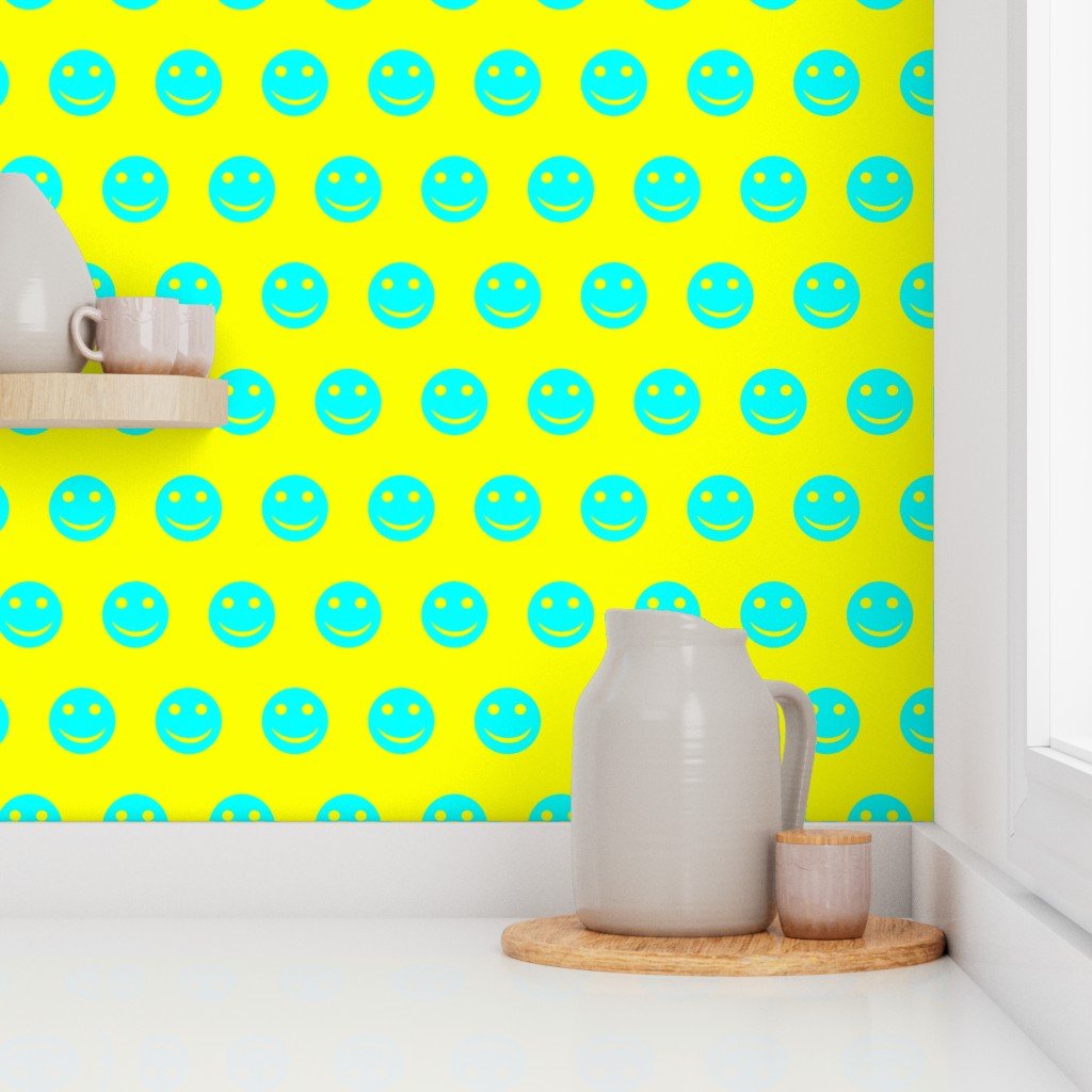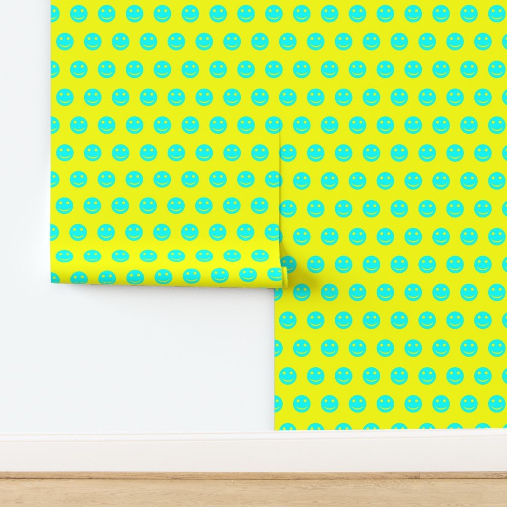 A lively pattern featuring neon aqua smiley faces against a bright yellow background.