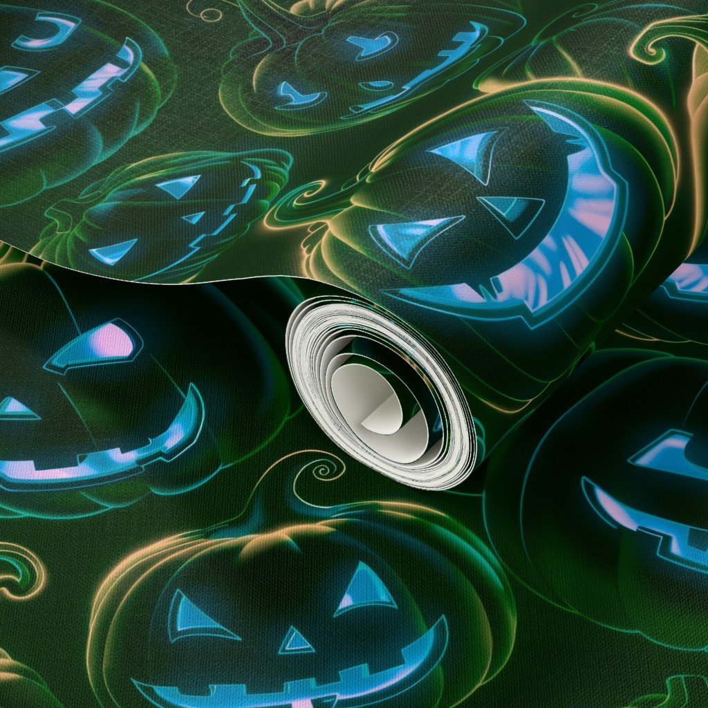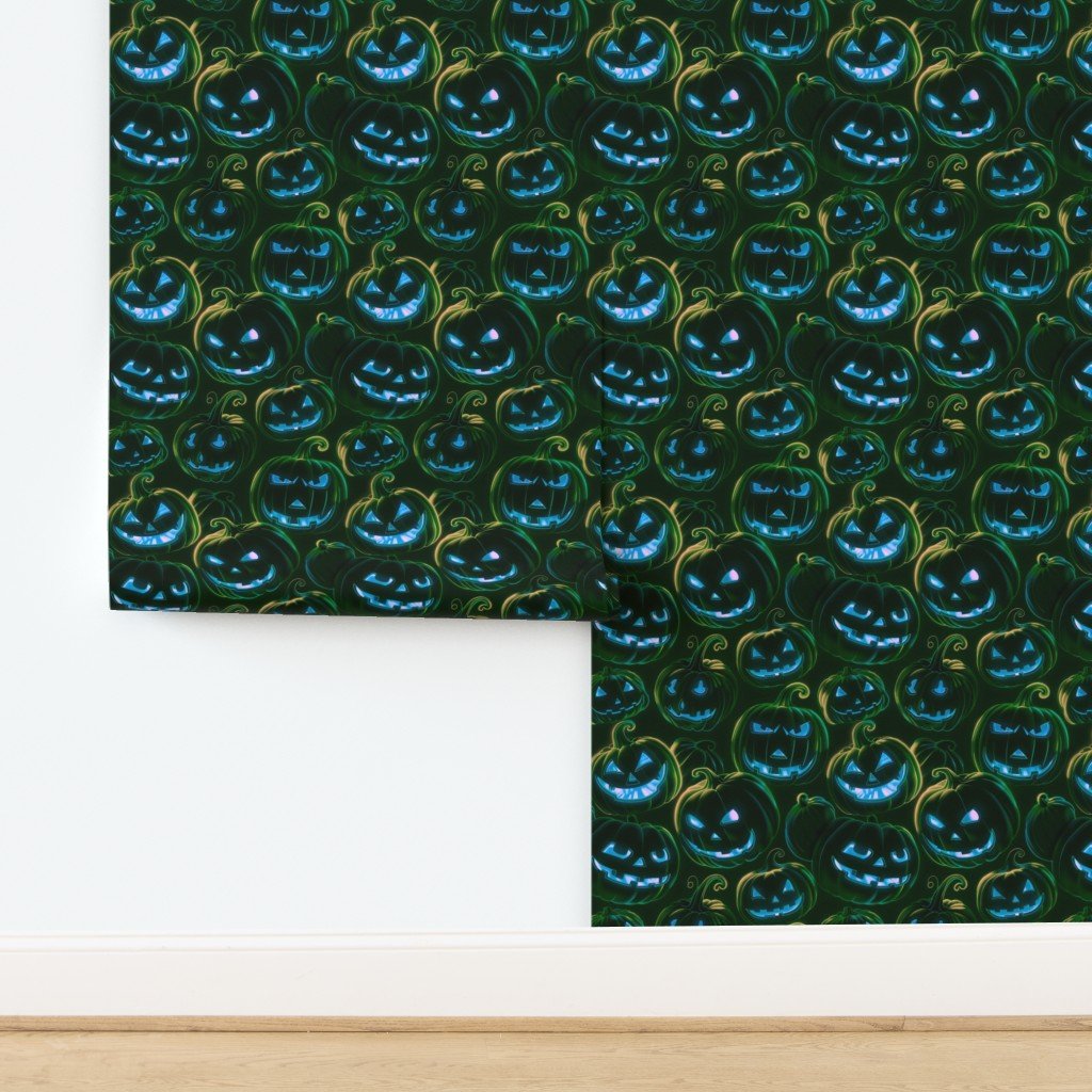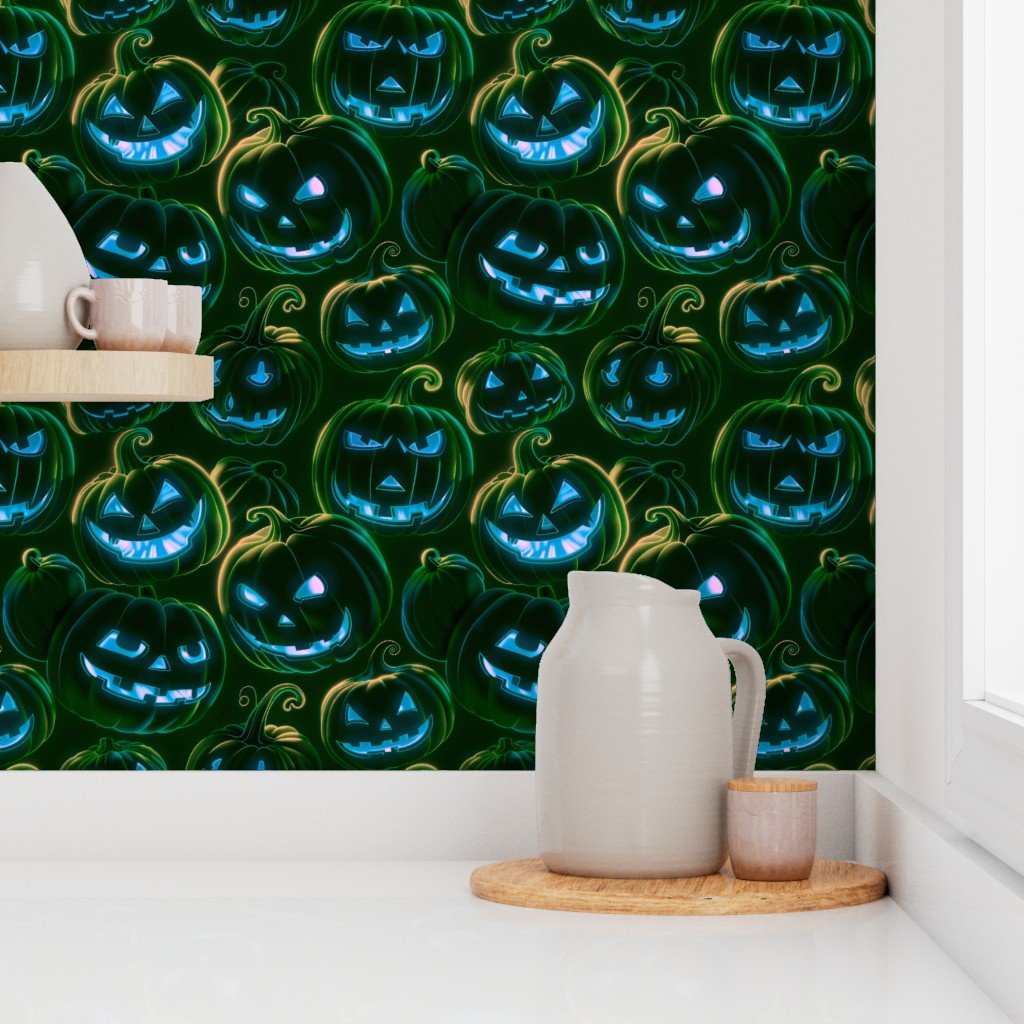 This captivating pattern features an array of neon-lit green pumpkins set against a dark, nighttime backdrop. The glowing pumpkins create a striking