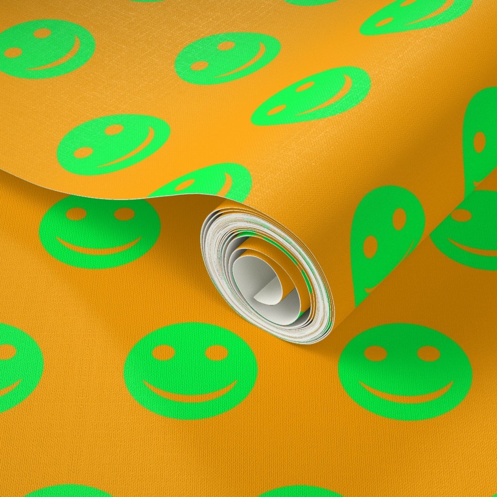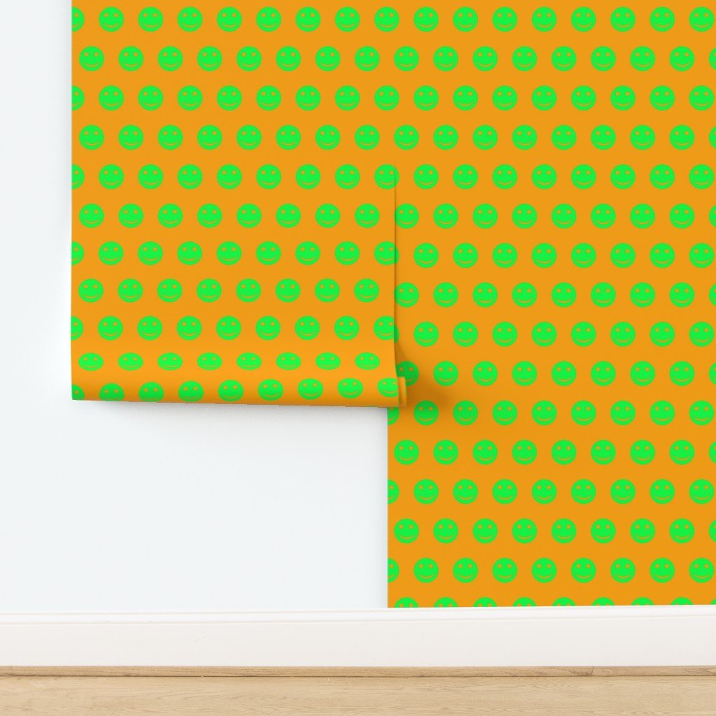 A striking pattern featuring neon green smiley faces set against a vivid orange background.