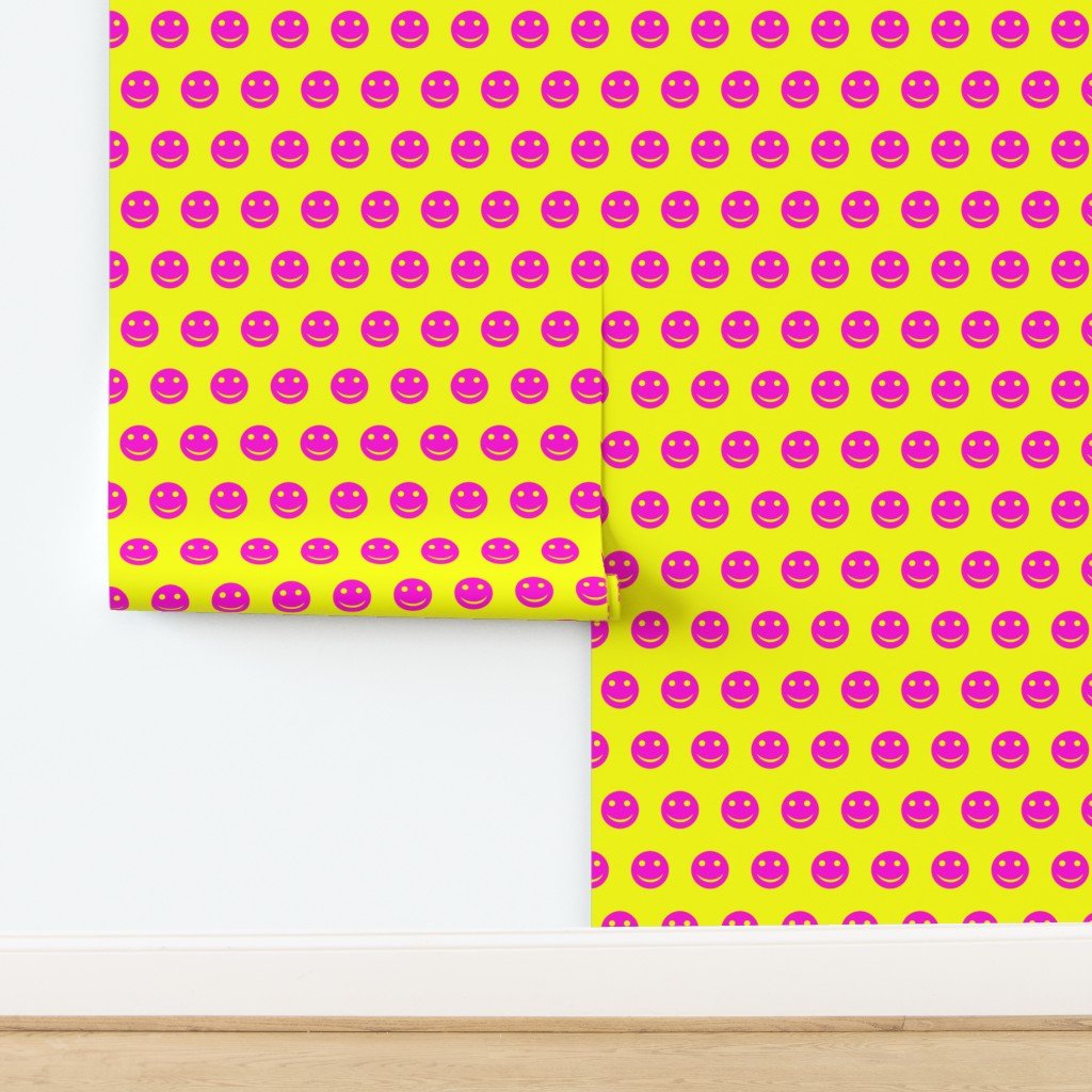 A fun and vibrant pattern featuring neon pink smiley faces against a bright yellow background. The lively and contrasting colors create a playful and