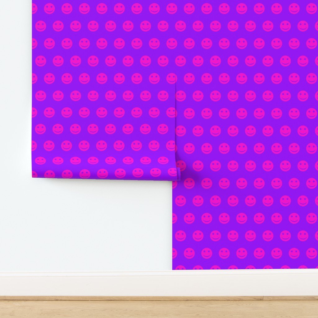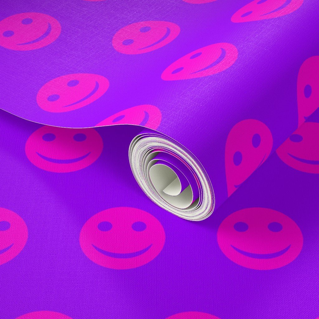 A striking pattern featuring neon pink smiley faces against a vivid purple background.