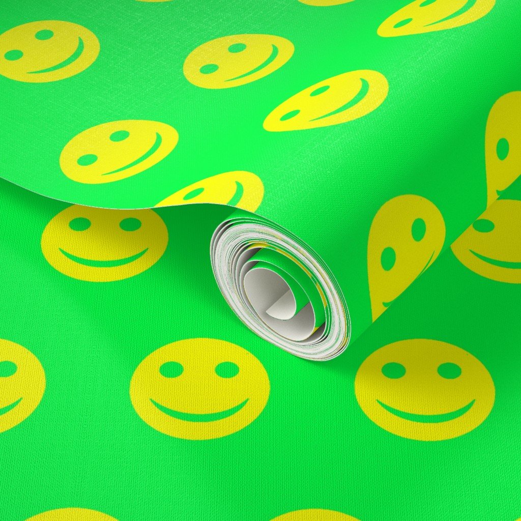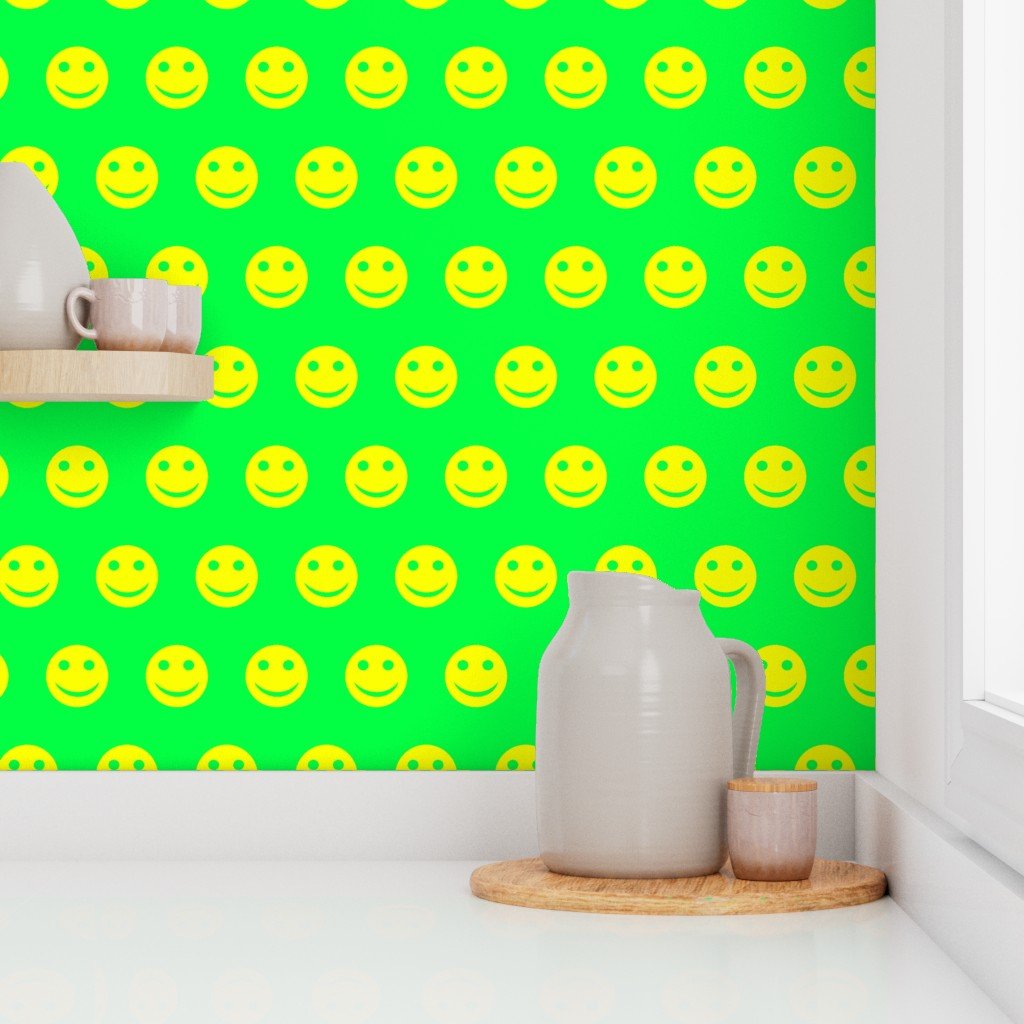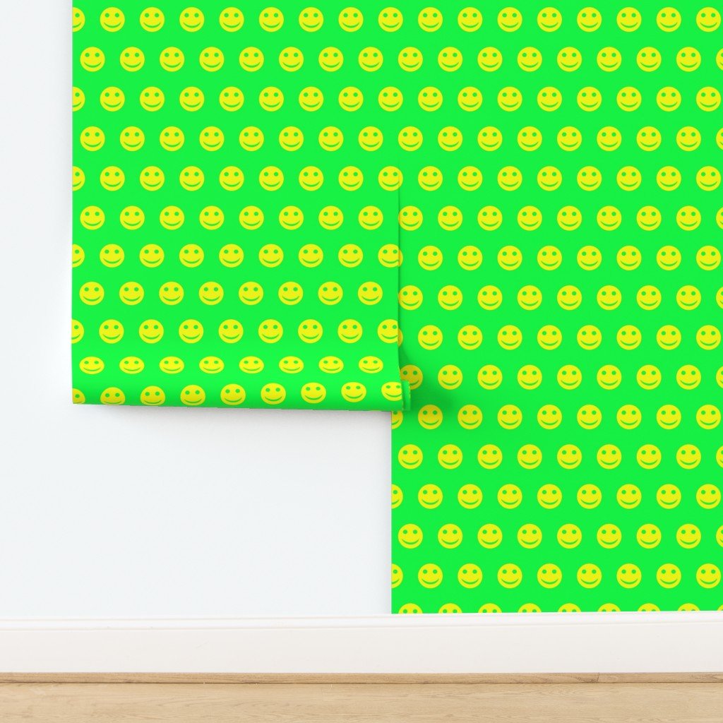 A lively and vibrant pattern featuring neon yellow smiley faces against a bright green background.