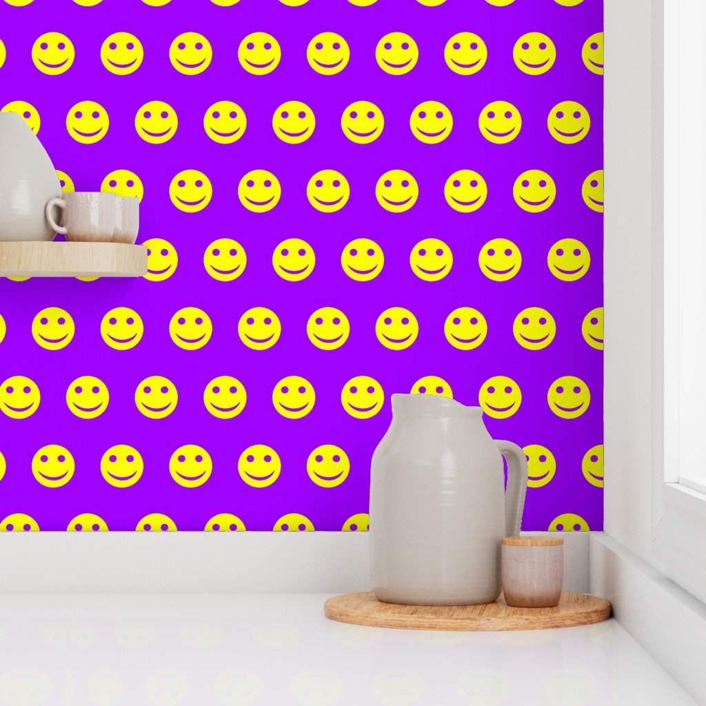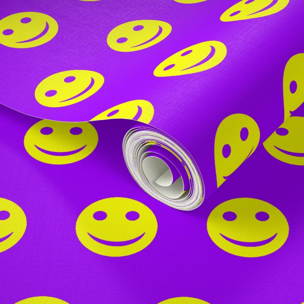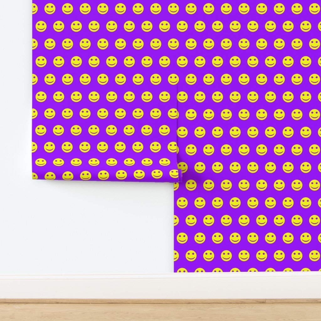 A dynamic and bold pattern featuring neon yellow smiley faces set against a bright purple background.