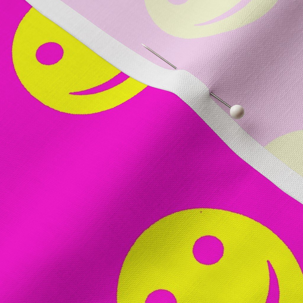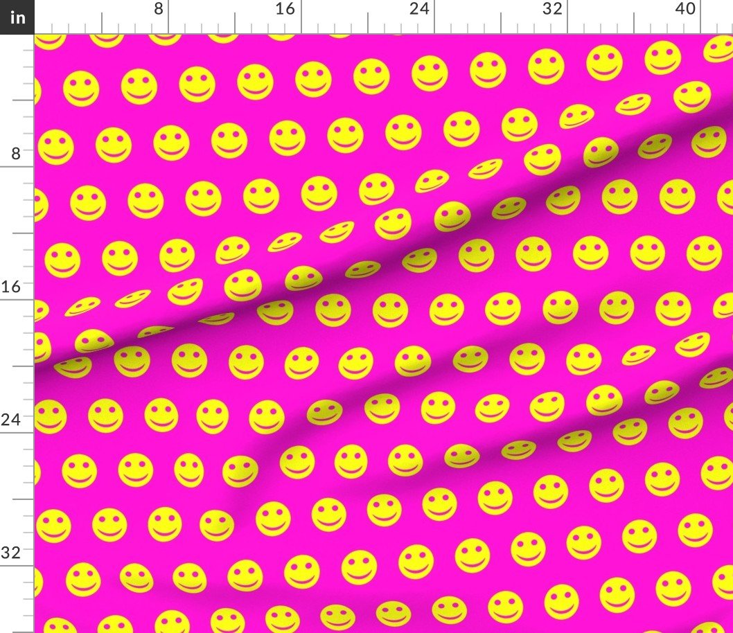 A playful and eye-catching pattern featuring neon yellow smiley faces set against a vibrant pink background.