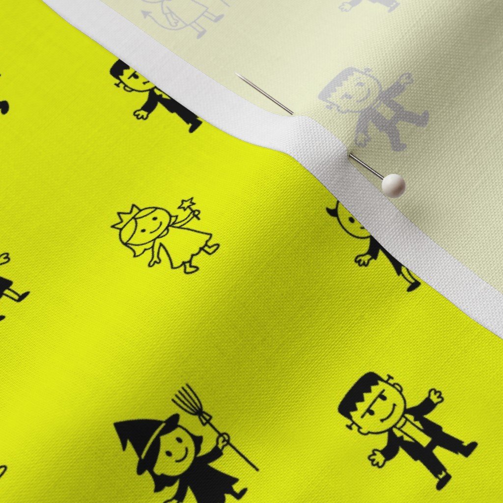 An electric neon yellow background sets the stage for playful black stick figures dressed in classic Halloween costumes. Great for quirky decor, party goods, or bold statement projects.