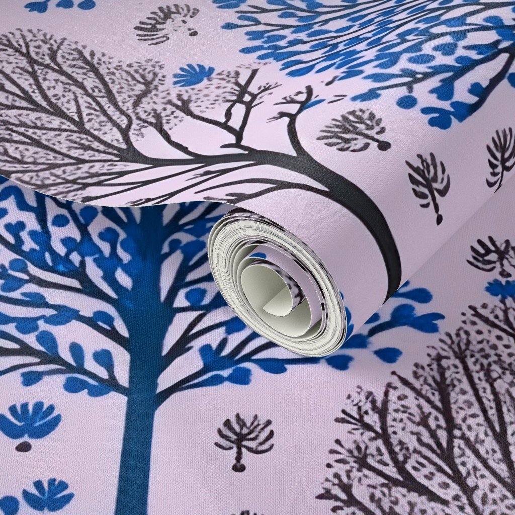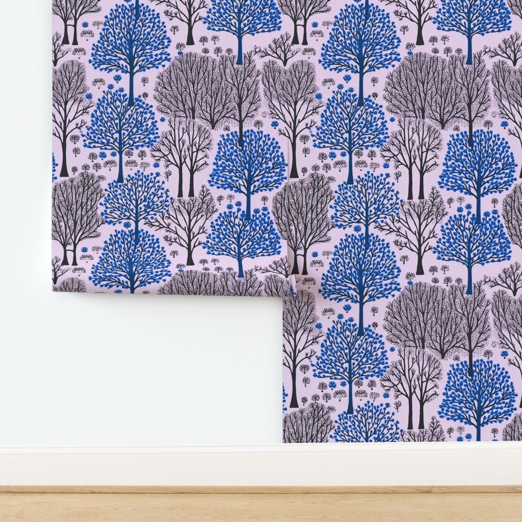 Watercolor-inspired pattern featuring a forest of bare trees highlighted by deep blue leaves and winter gray branches.