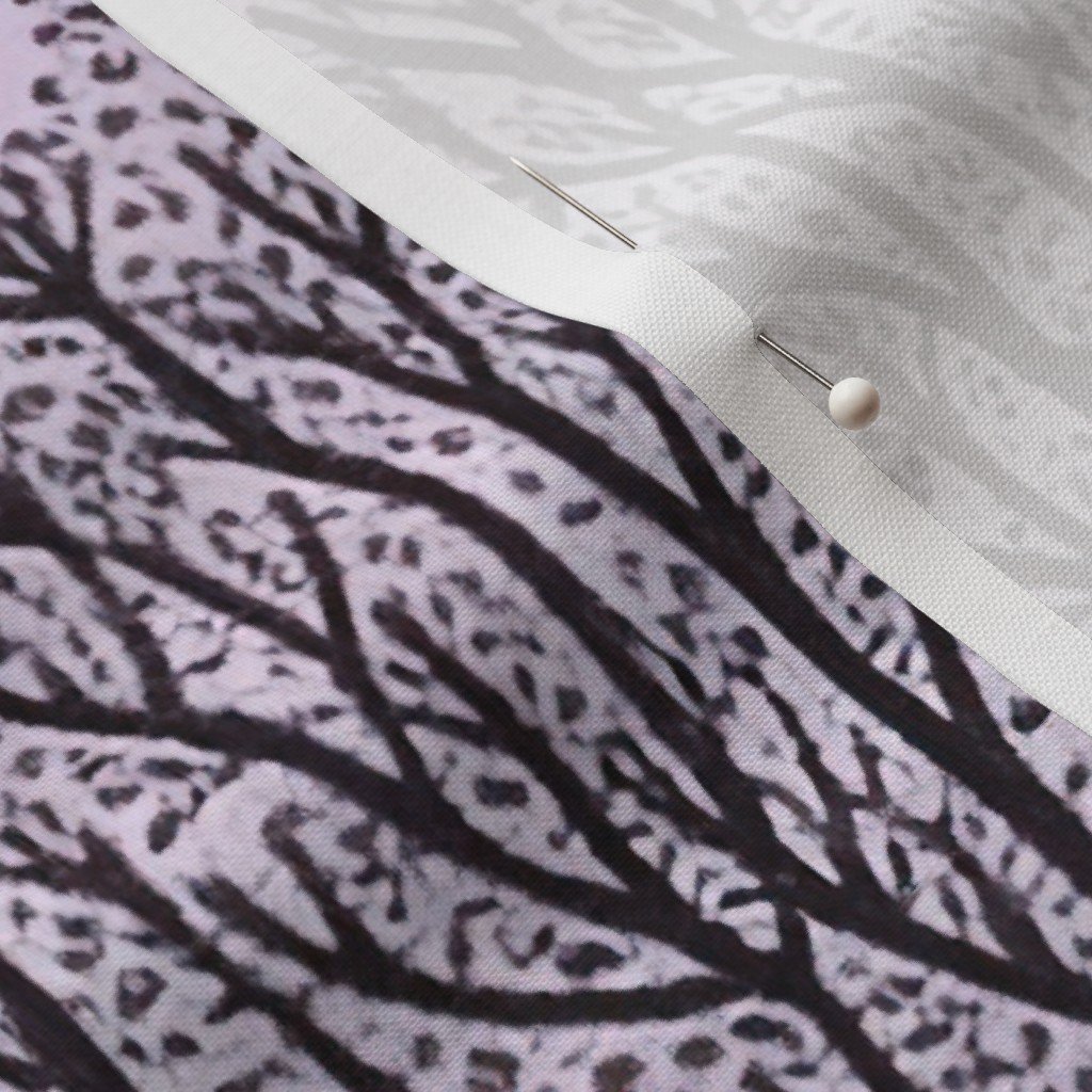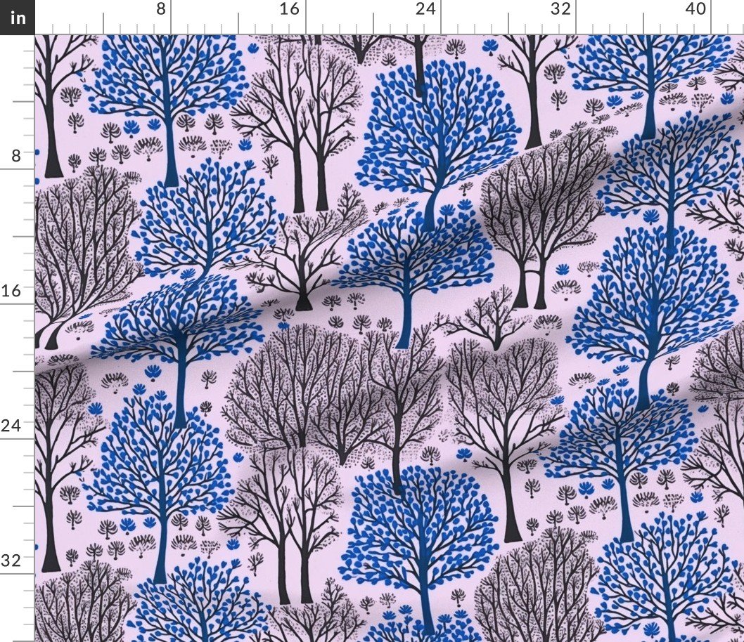Watercolor-inspired pattern featuring a forest of bare trees highlighted by deep blue leaves and winter gray branches. SpecificationsFabric content: 100% CottonPrinted width: 42 inchesWeight: 4.4 oz/yd²Opacity: OpaqueConstruction: Plain WeaveShrinkage: 5-6% length x 2-3% widthThread count: 120Performance RatingsWyzenbeek (cotton duck abradant): 30,000 double rubs (ASTM D1457-13)Martindale: 20,000 cycles (ASTM 4966-22)Crocking dry (1 severe – 5 no color transfer): Exceeds 3 (AATCC TM 8)Crocking wet (1 severe – 5 no color transfer): Exceeds 3.5 (AATCC TM 8)Pilling (1 severe – 5 none): 4.5Note or Country of OriginCountry: Woven in IndonesiaPrinting: Digitally printed in the USA with water-based inksFabric backing: The backside of the fabric will be unprinted
