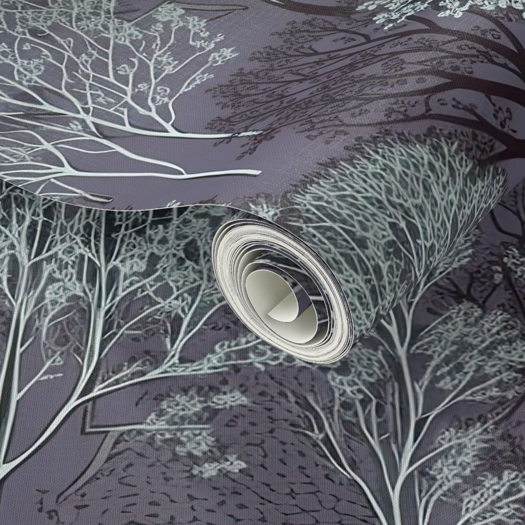 In this Twilight Blue variation of the New England Endless Forest, delicate winter trees shimmer in soft icy tones over a deep violet-blue base. A serene, dreamlike woodland print perfect for seasonal textiles.