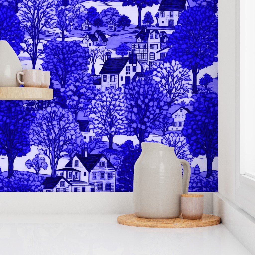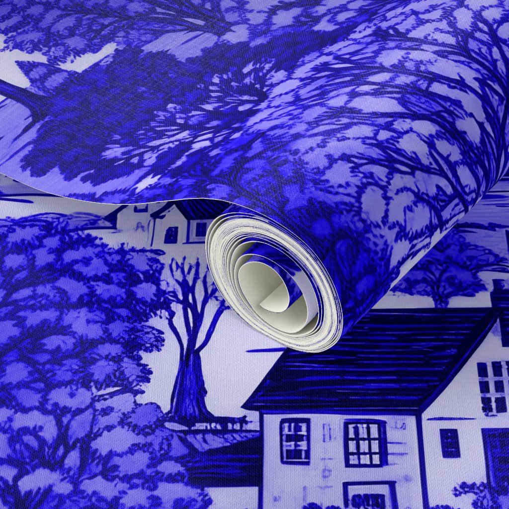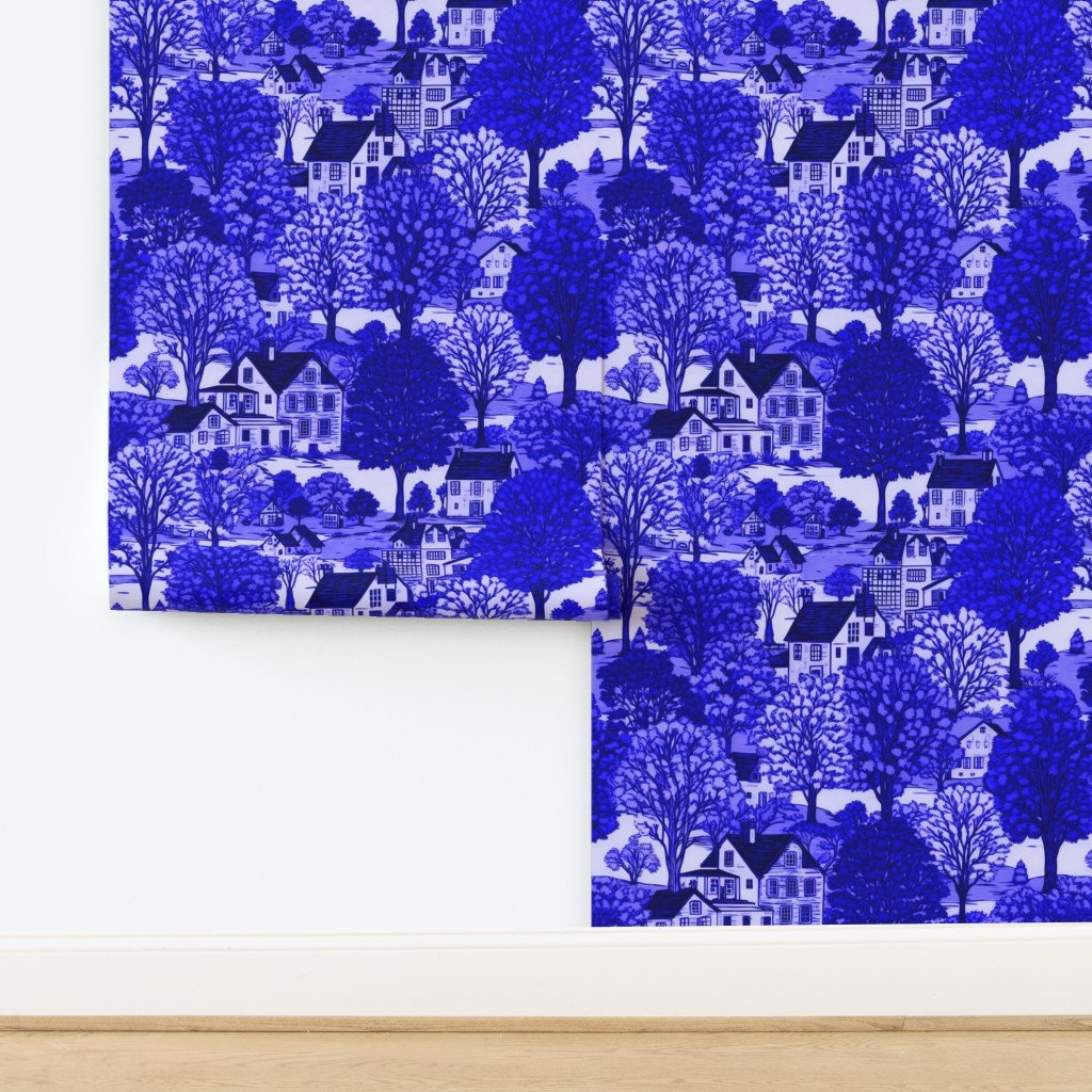 New England Village Houses with Trees in Royal Blue Porcelain Glaze Wallpaper