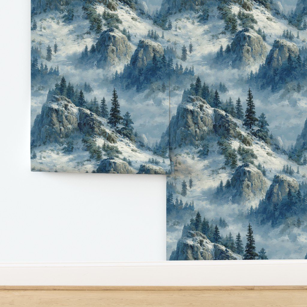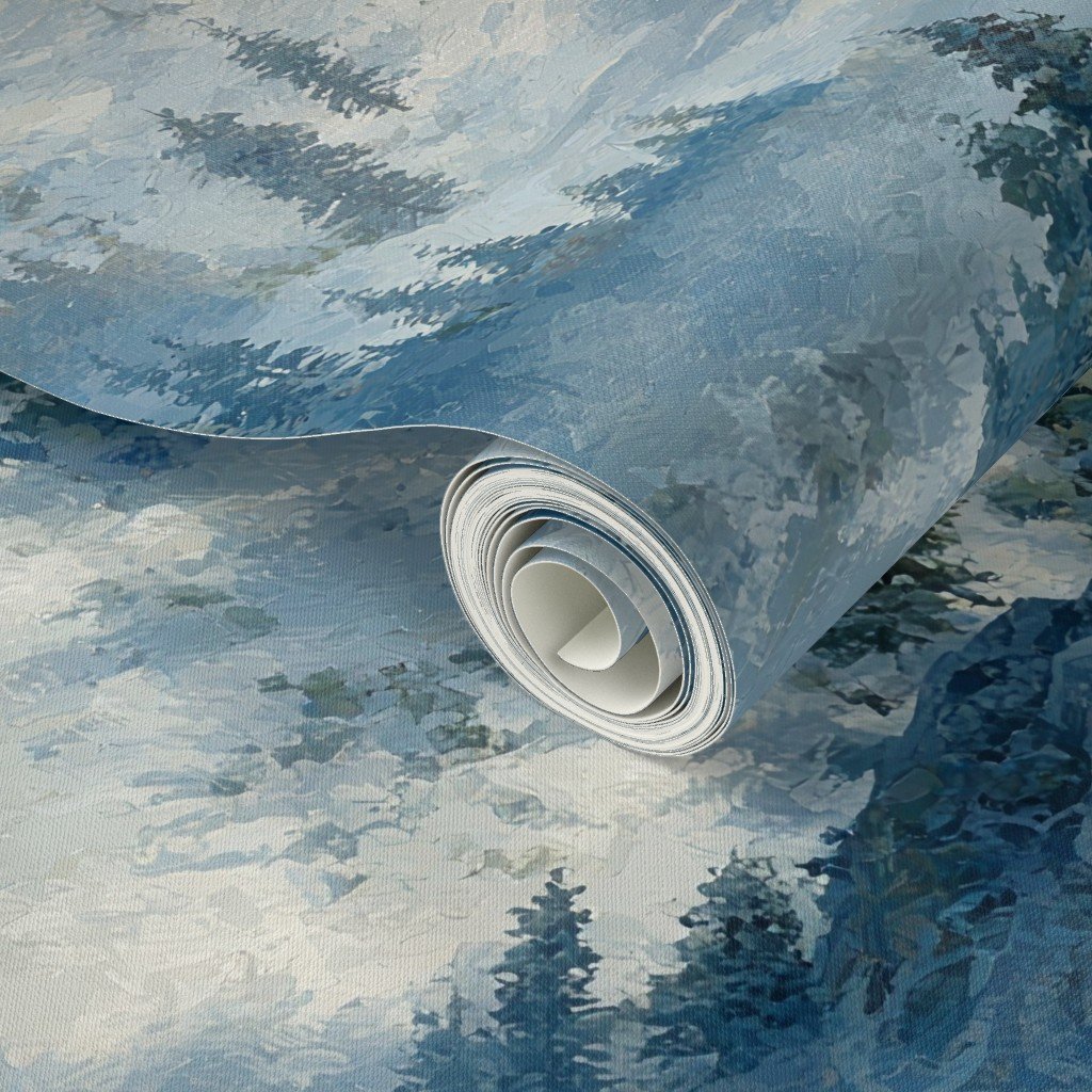 A festive winter watercolor of Olympic National Park with snowy mountains, frosted rainforest trees, and a rugged icy coastline. Cool blues and silvery whites blend with hints of holiday red and green for Christmas charm.