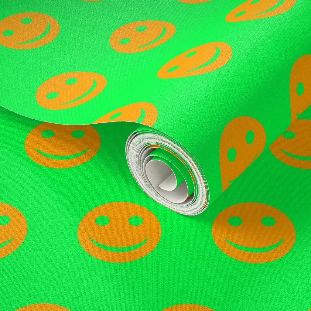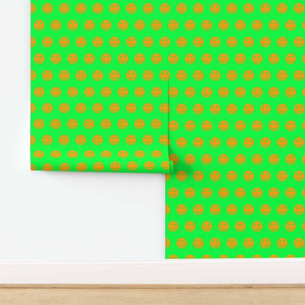 A bold and energetic pattern featuring orange smiley faces set against a bright green background.