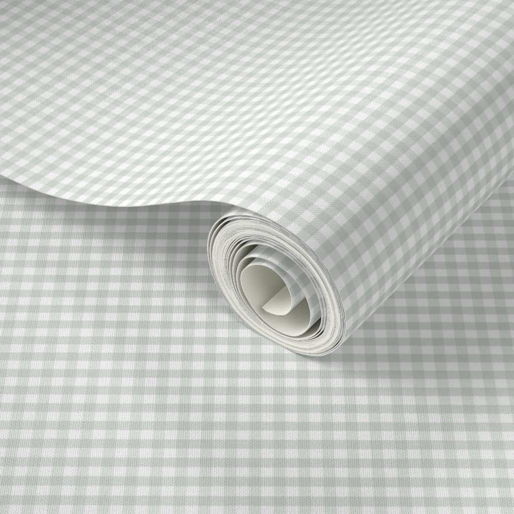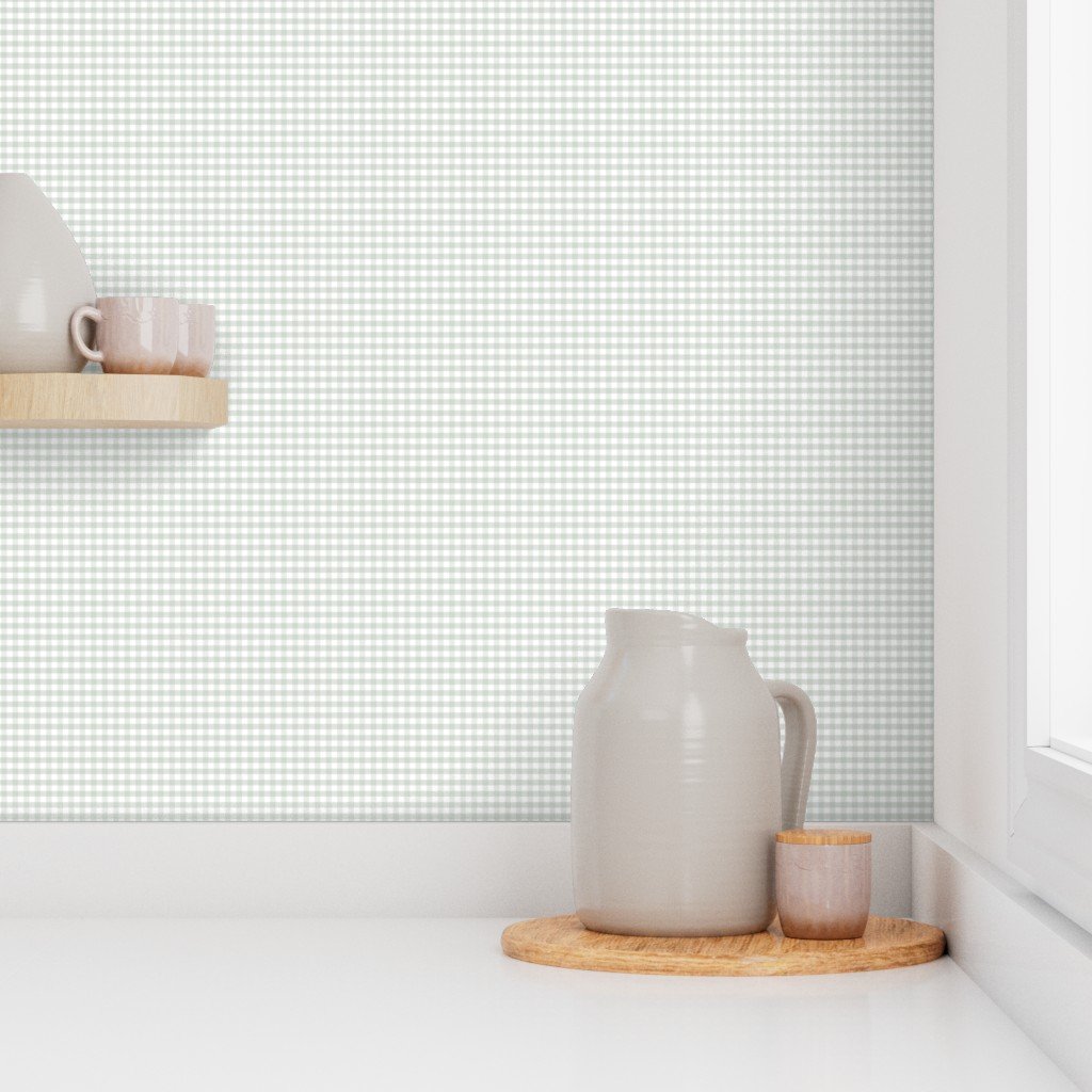 Small gingham checks in soft pale sage green and white ideal for baby bedding cushions sewing aprons kitchen projects and vintage inspired fabric crafts with a calm earthy tone perfect for cozy cottage themes neutral decor and modern rustic interiors