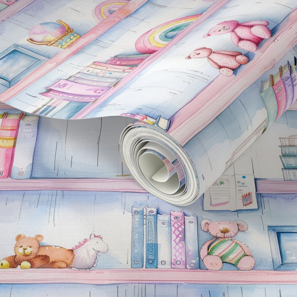 This sweet pattern features a pastel rainbow bookcase filled with children’s toys, illustrated in a delicate watercolor style.