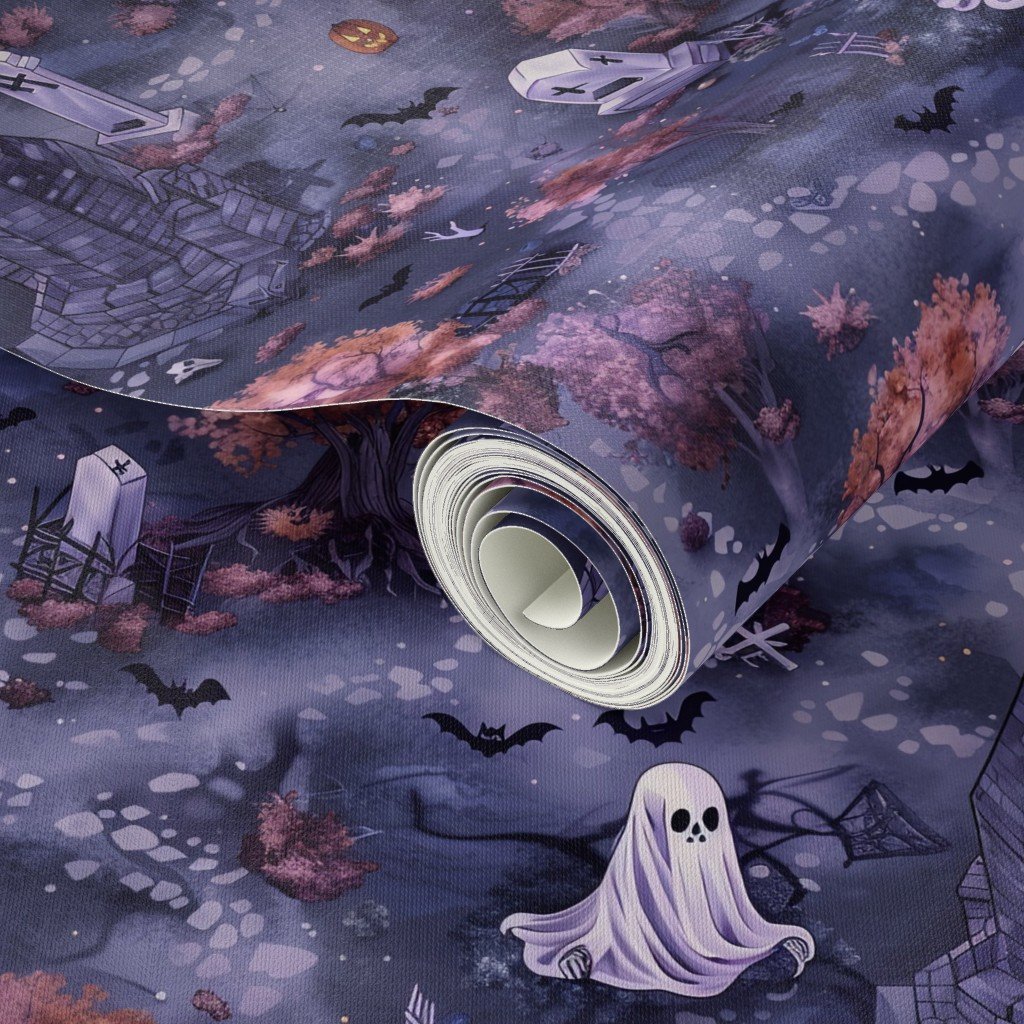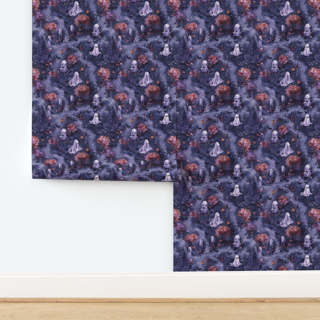 An eerie Halloween scene featuring a purple graveyard with glowing ghostly figures and pumpkins. The detailed pattern includes spooky tombstones.
