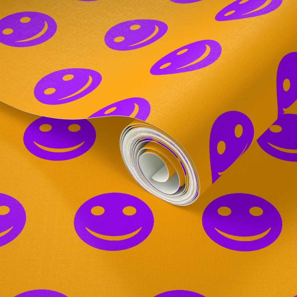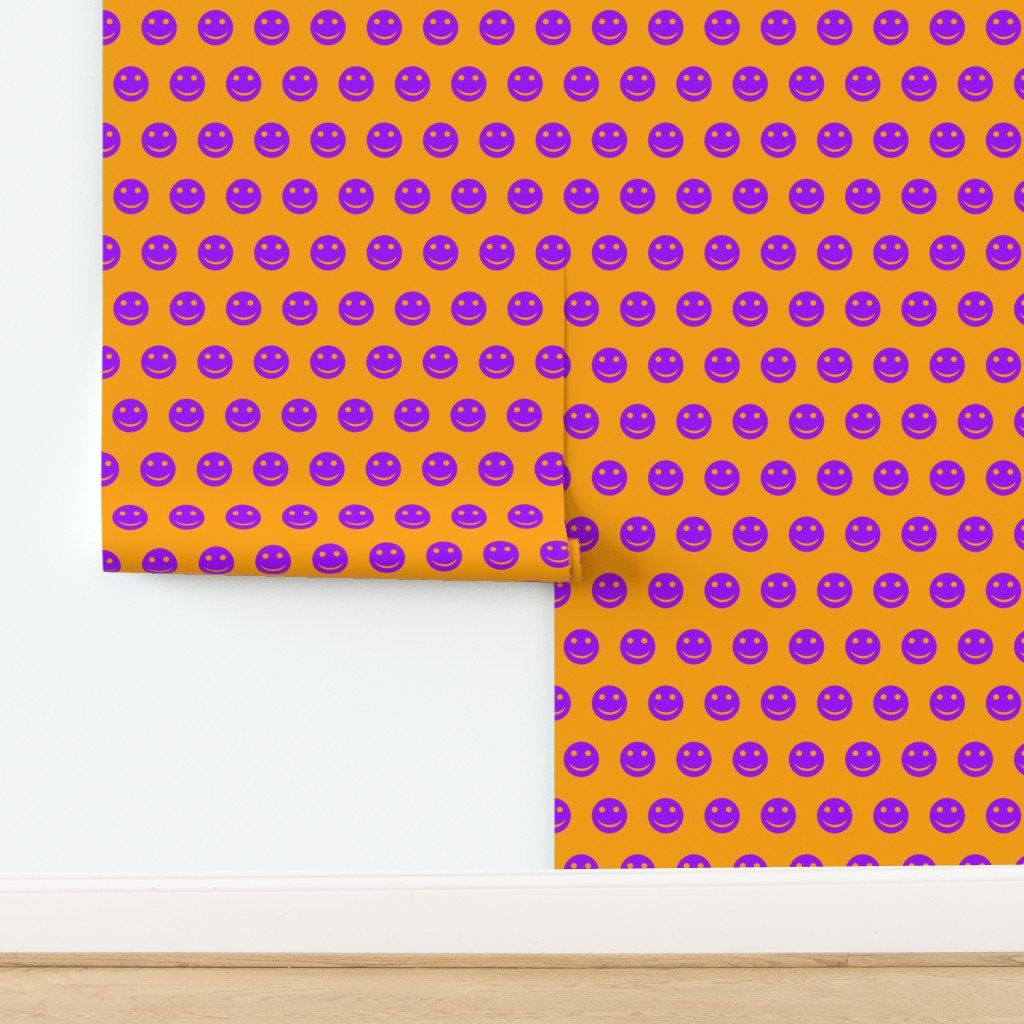 A bold and cheerful pattern featuring purple smiley faces set against a bright orange background.