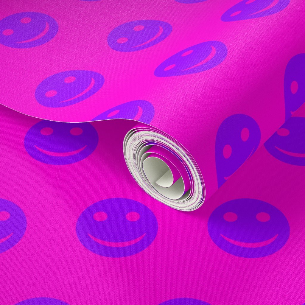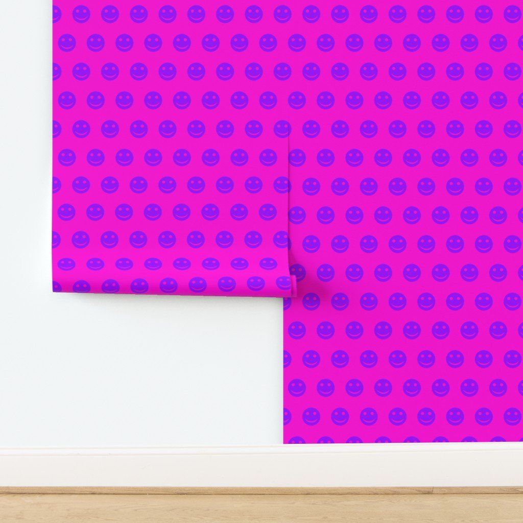 A vibrant and playful pattern featuring purple smiley faces set against a bright pink background.