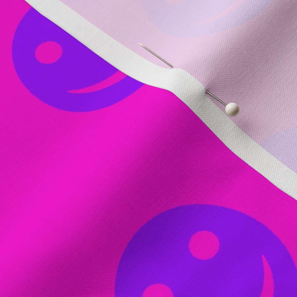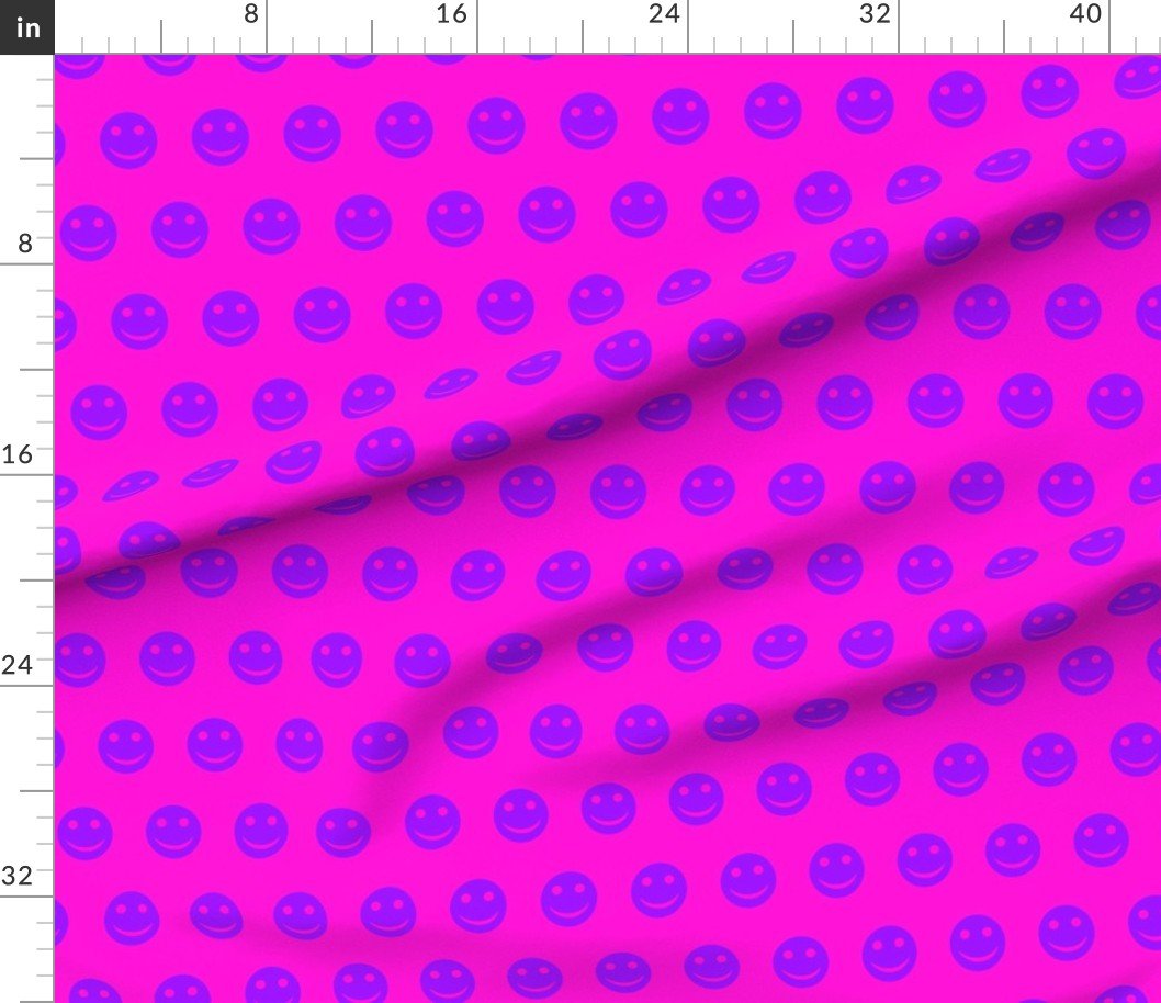 A vibrant and playful pattern featuring purple smiley faces set against a bright pink background.