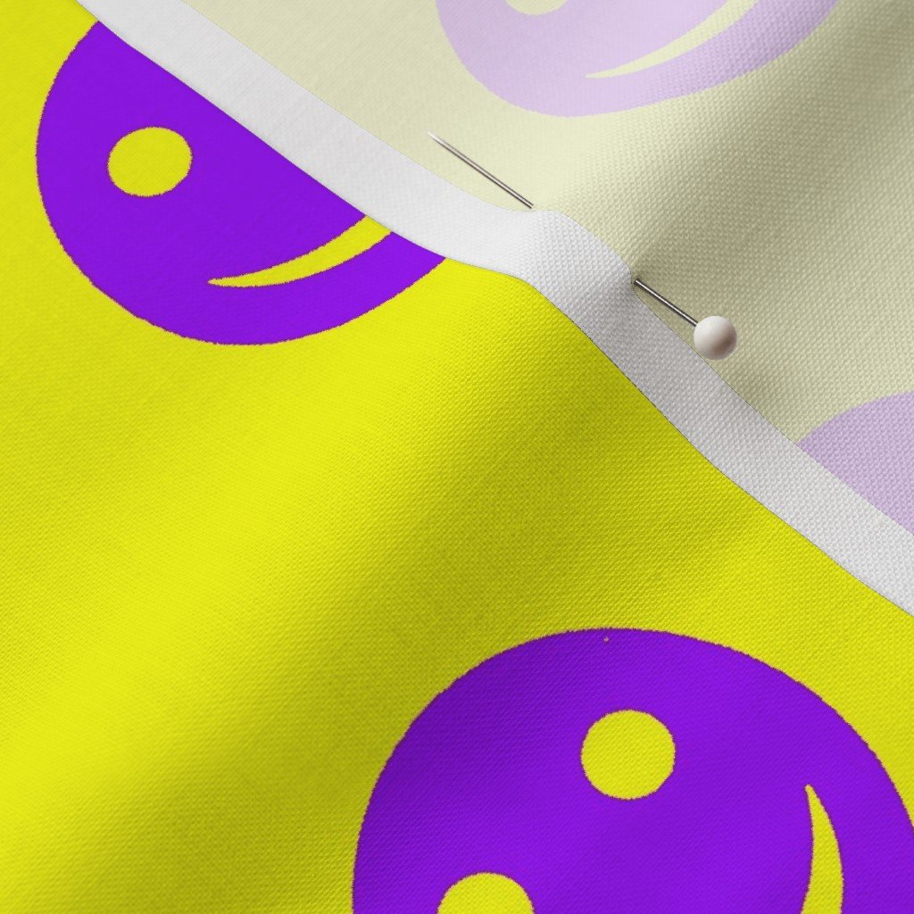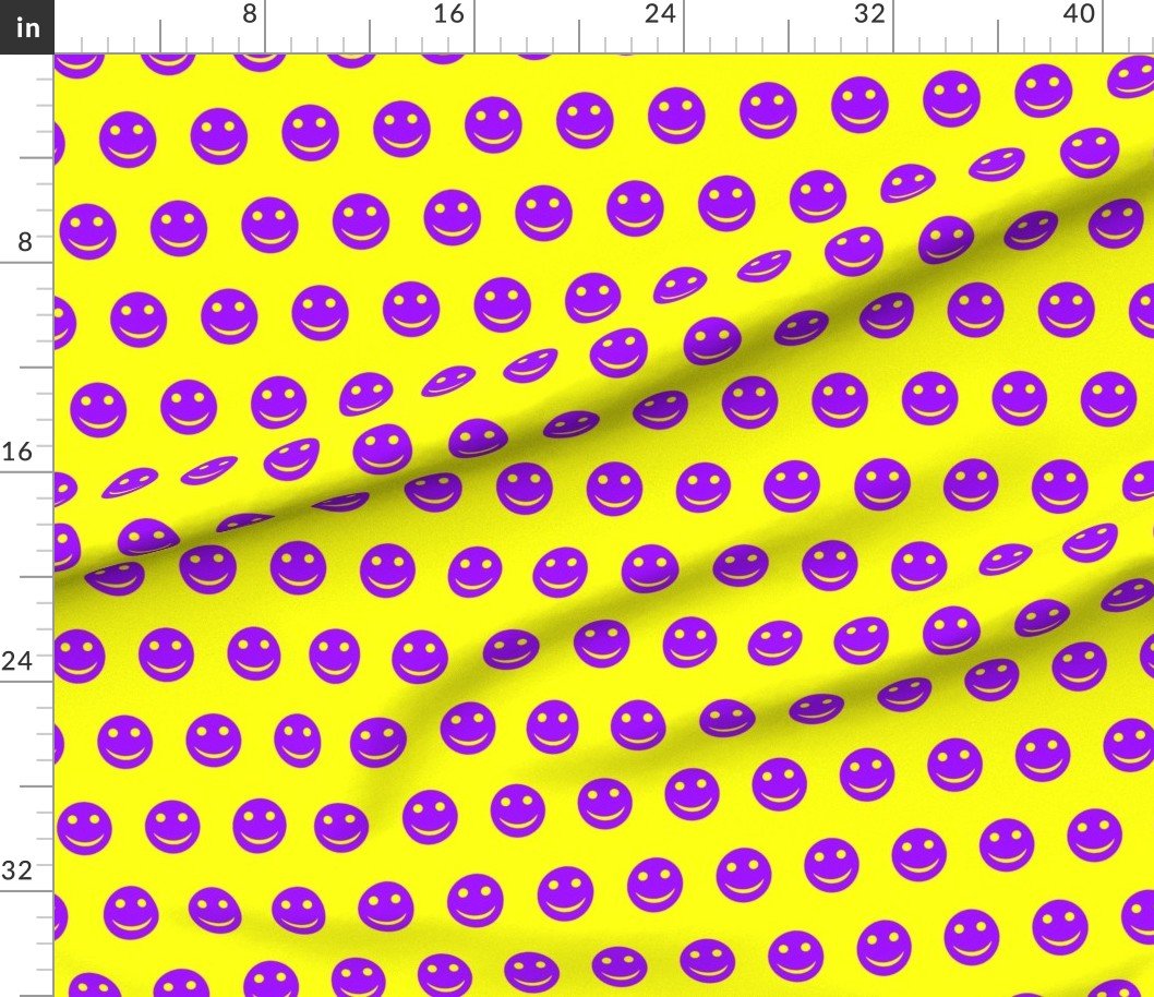 A cheerful and eye-catching pattern featuring purple smiley faces on a vivid yellow background.