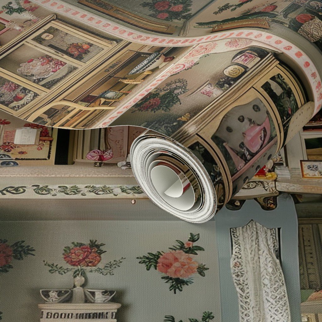 Sweet, ditsy dollshouse rooms with pastel decorations and furnishings make charming wallpaper, bedding , upholstery and curtains for children’s decor