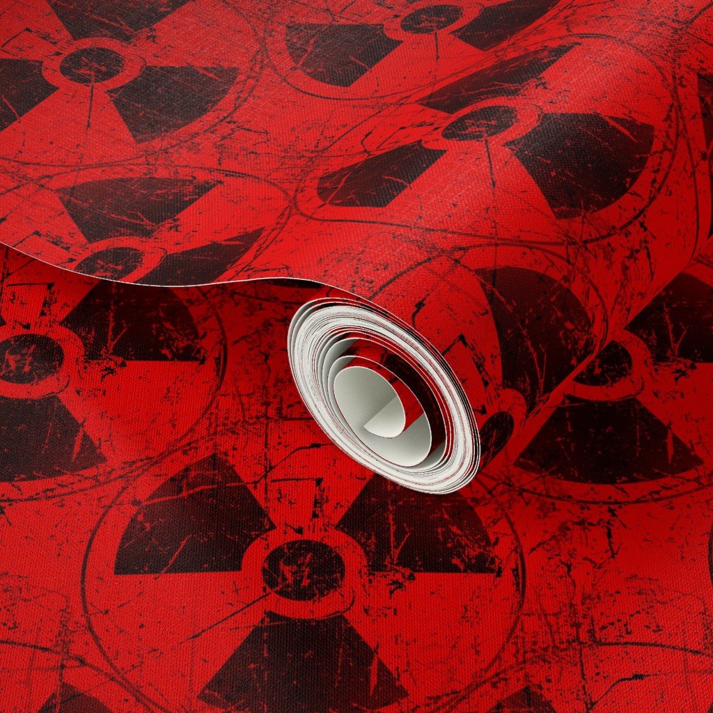 Repeating pattern of radiation hazard symbols on a red background.