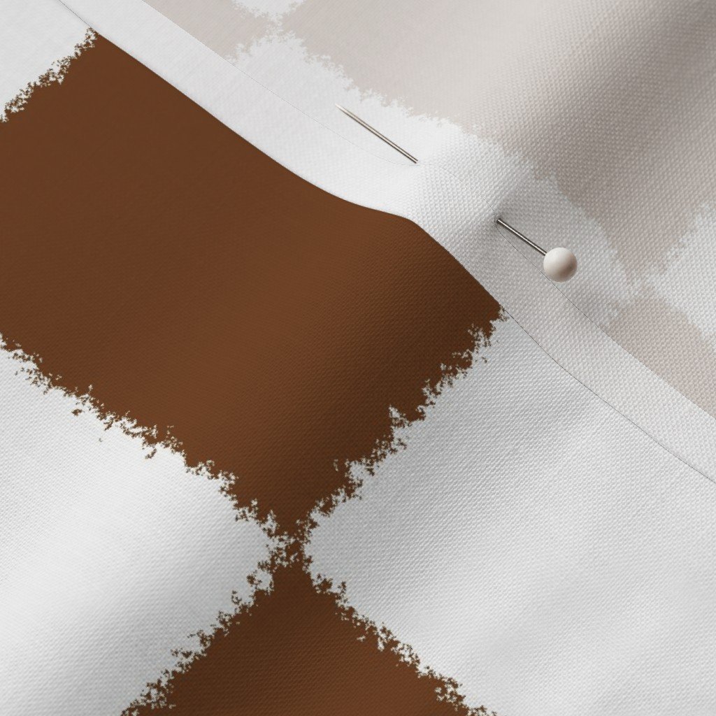 This rich saddle brown and white checkerboard pattern with tumbled edges evokes the warmth and rugged beauty of the wilderness.SpecificationsFabric content: 100% CottonPrinted width: 42 inchesWeight: 4.4 oz/yd²Opacity: OpaqueConstruction: Plain WeaveShrinkage: 5-6% length x 2-3% widthThread count: 120Performance RatingsWyzenbeek (cotton duck abradant): 30,000 double rubs (ASTM D1457-13)Martindale: 20,000 cycles (ASTM 4966-22)Crocking dry (1 severe – 5 no color transfer): Exceeds 3 (AATCC TM 8)Crocking wet (1 severe – 5 no color transfer): Exceeds 3.5 (AATCC TM 8)Pilling (1 severe – 5 none): 4.5Note or Country of OriginCountry: Woven in IndonesiaPrinting: Digitally printed in the USA with water-based inksFabric backing: The backside of the fabric will be unprinted