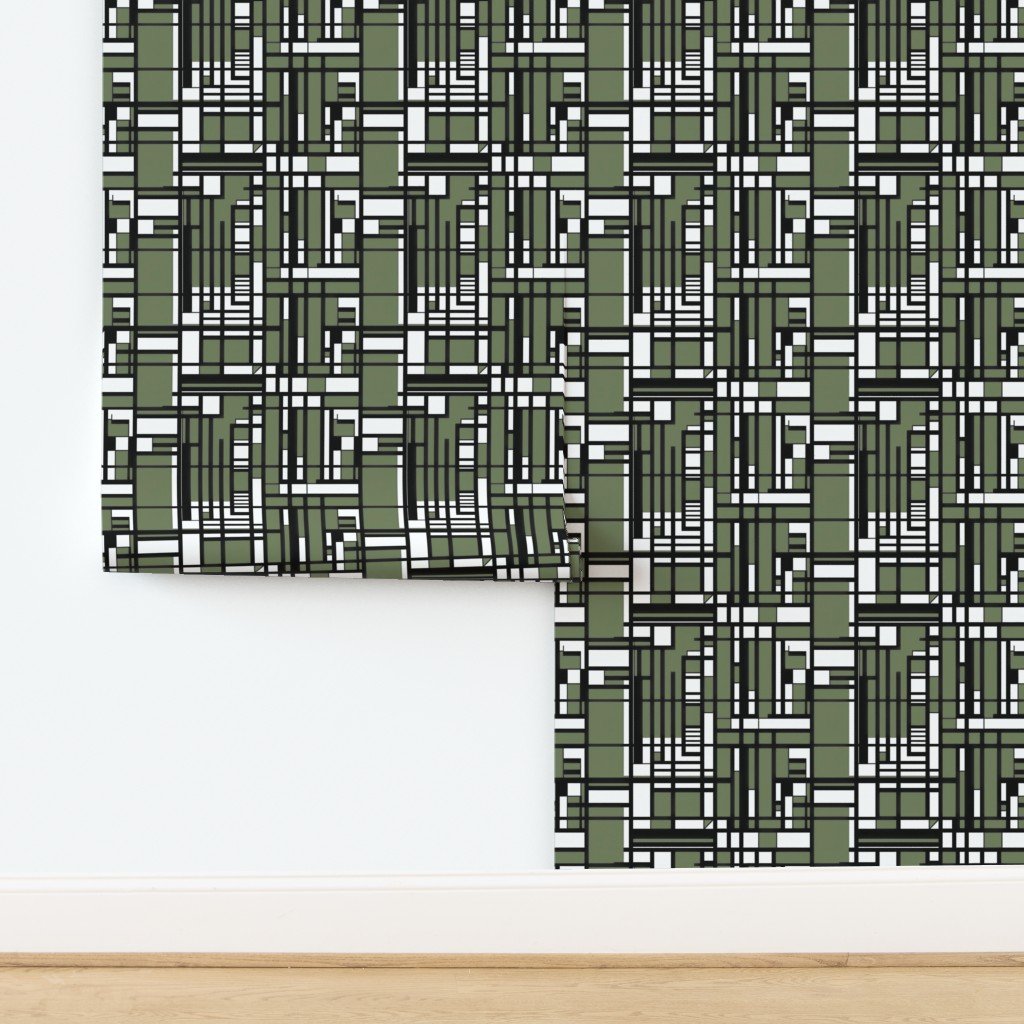 Sage green blocks meet black lines and white space in this clean, modern geometric grid inspired by city layouts and structure.