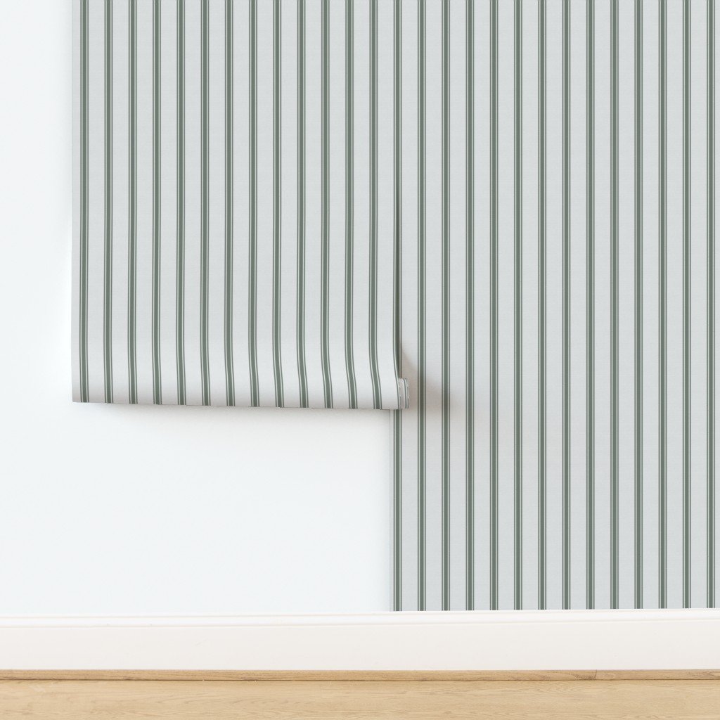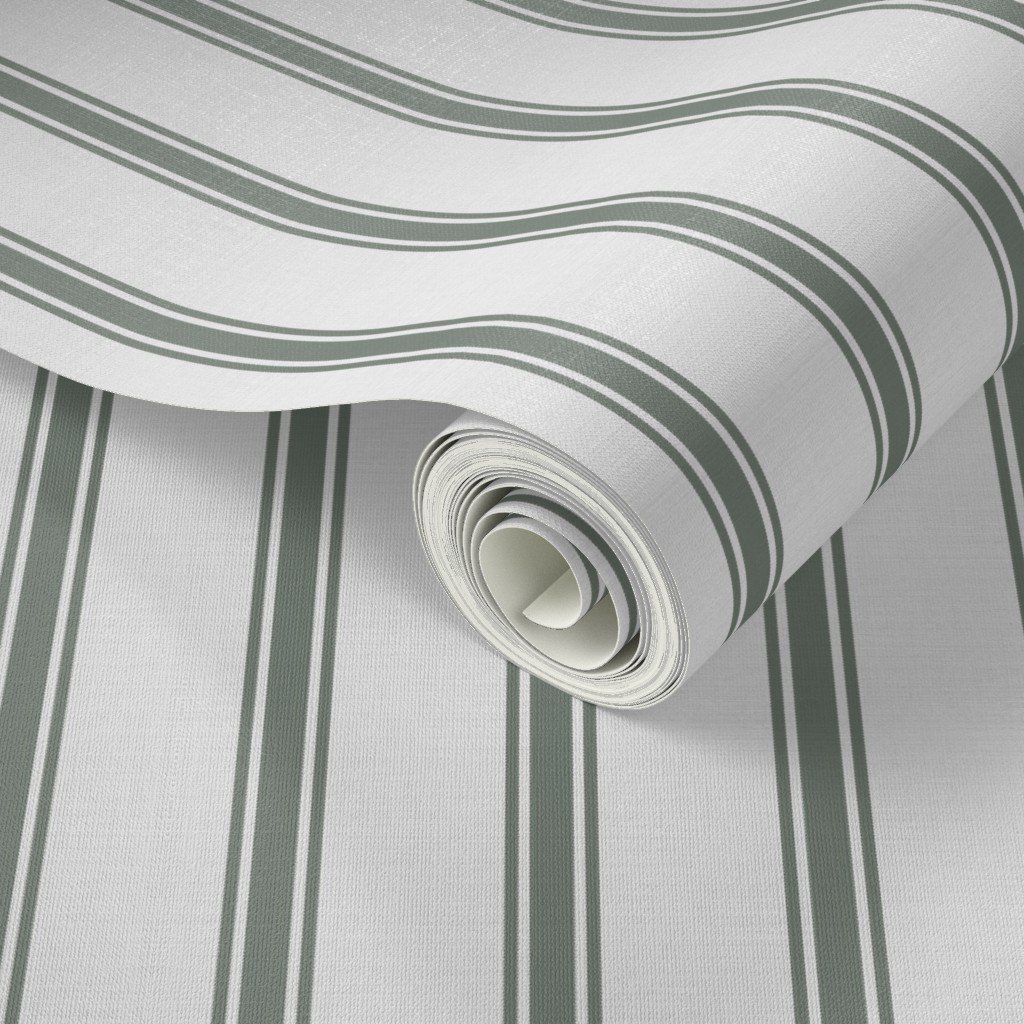 Stitched and woven straight vertical lines of one sage grey green stripe either side of a wider stripe in off-white are seen in French provincial