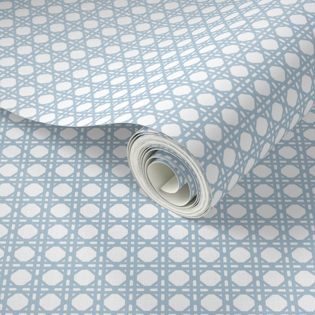 Woven rattan in sky blue on white in symmetrical geometric shapes for French Provincial Winter coordinates