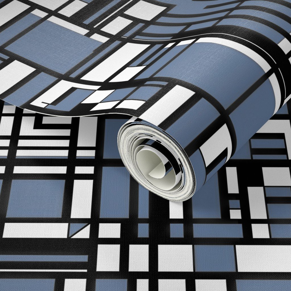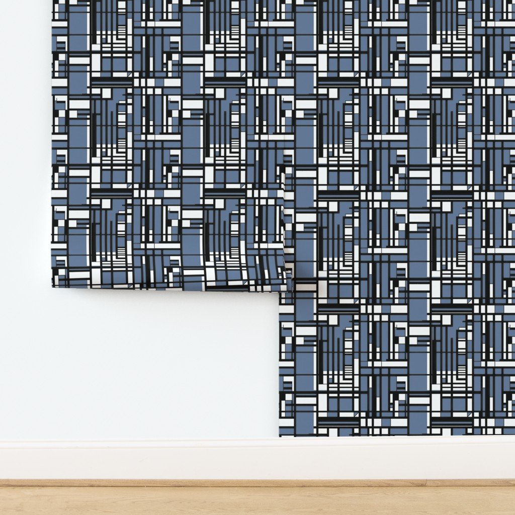 Slate blue blocks with crisp black lines and white contrast form this bold geometric design inspired by city grids and modern structure.