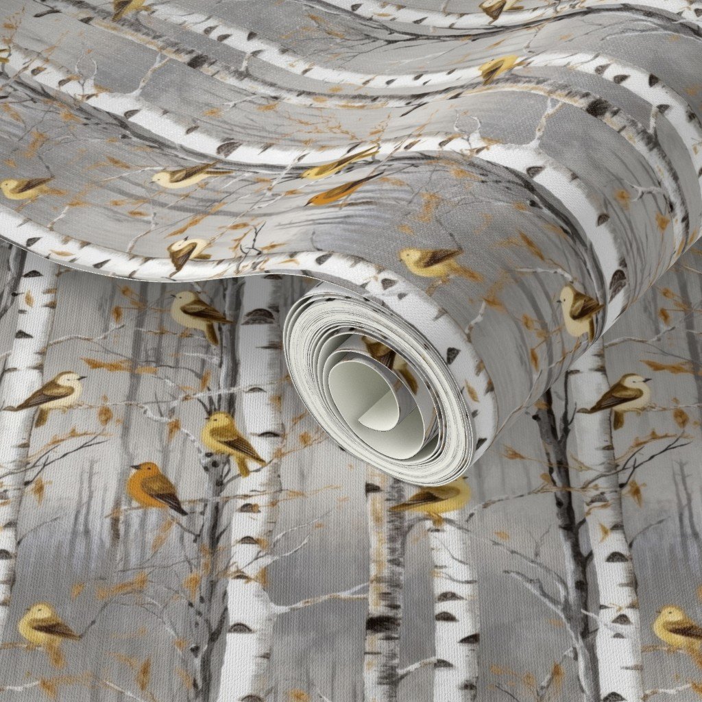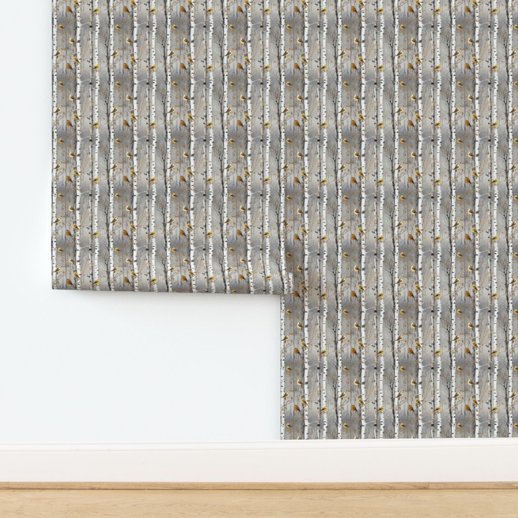 This serene pattern features birch trees in a wintery landscape, adorned with yellow and orange birds perched on the branches.