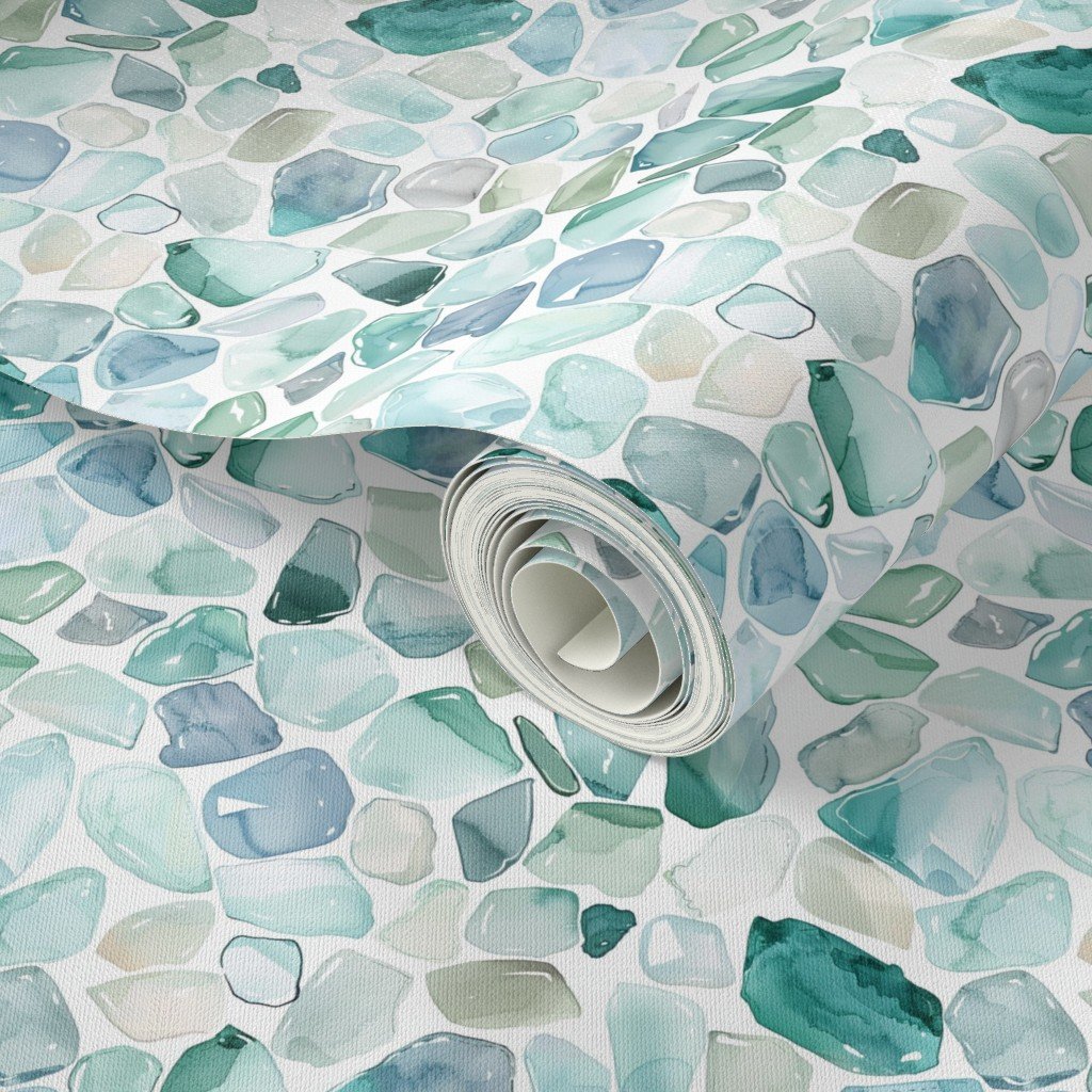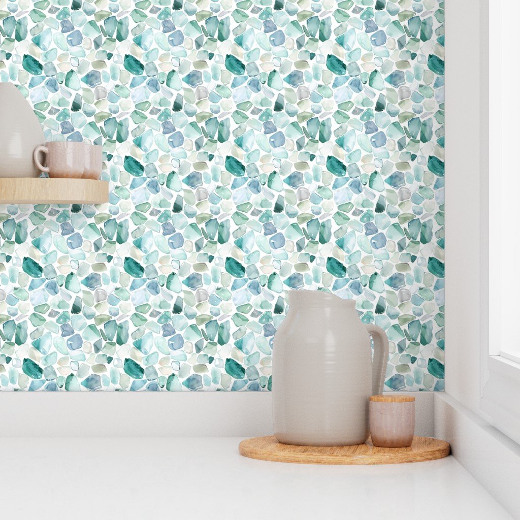 Tumbled by the waves, these blue and aqua broken shards of seaglass are scattered in a random watercolor repeat.