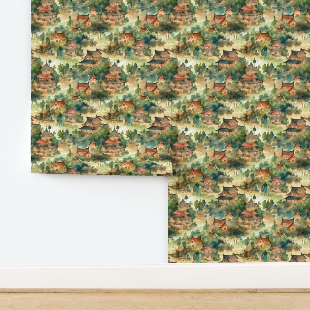 Chinese Village in Forest Watercolor Wallpaper
