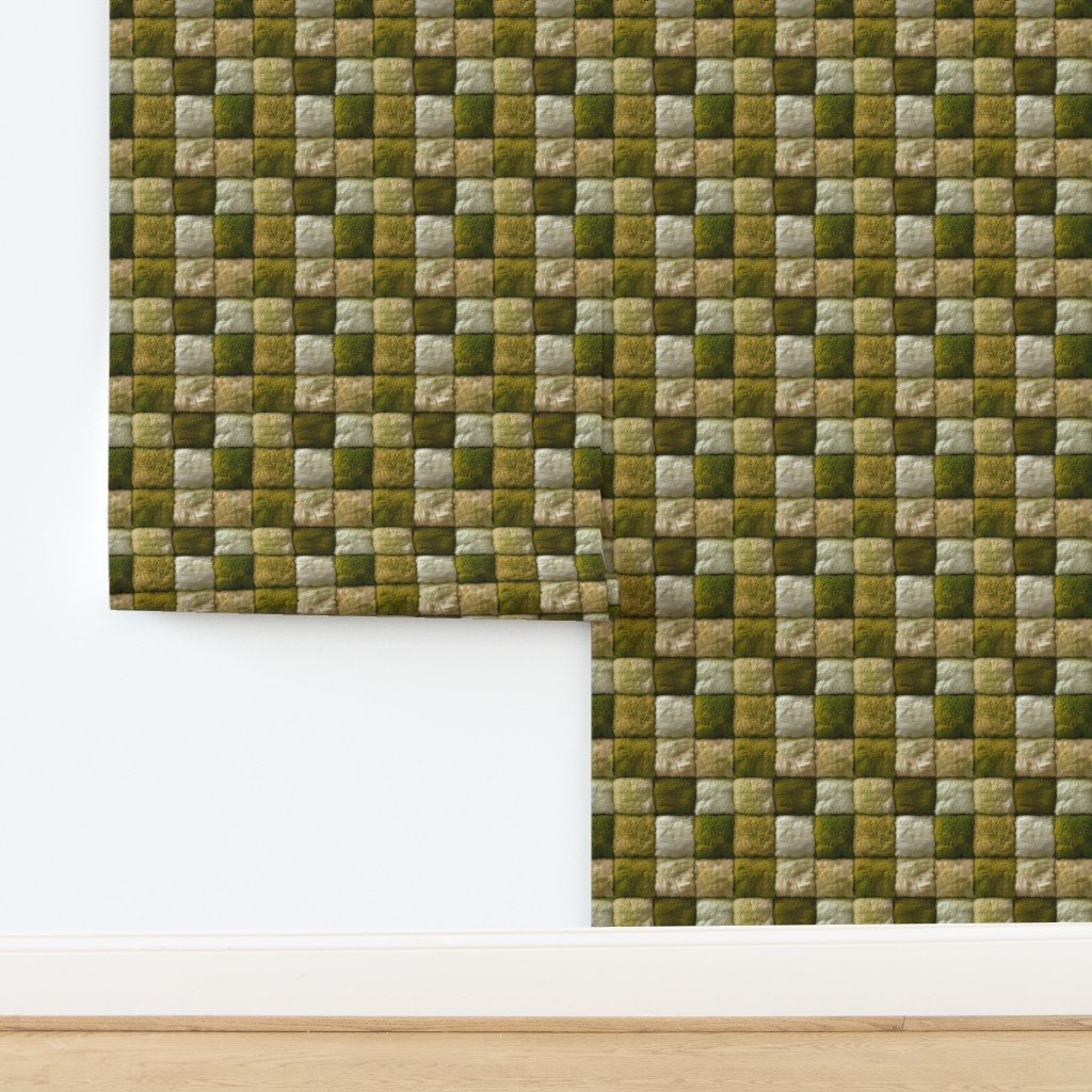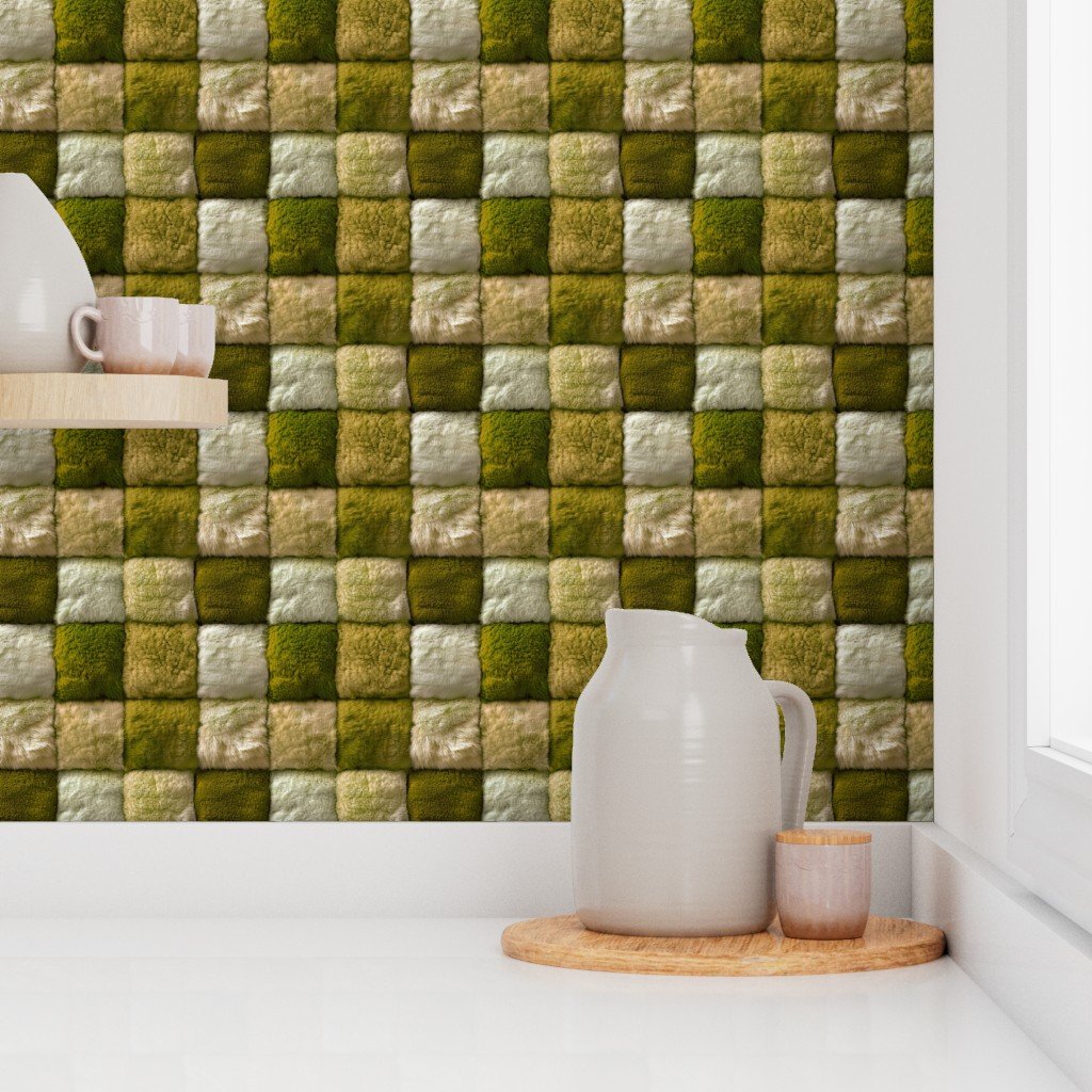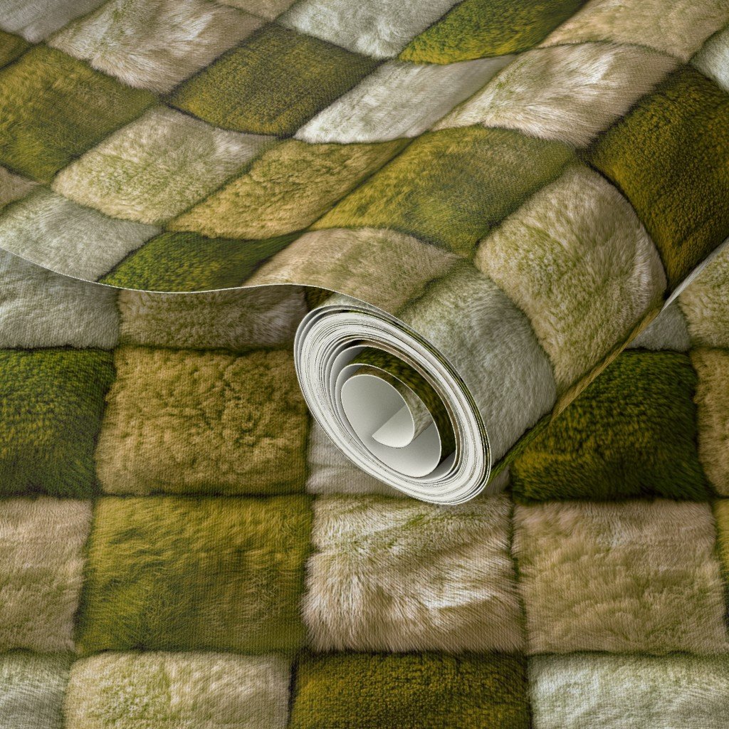 Forest green and ivory faux fur patchwork fabric features a serene blend of rich green tones and creamy ivory hues