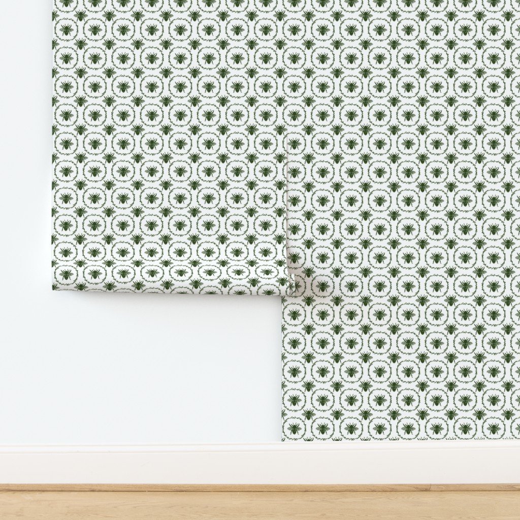Monochrome small lichen green bees encircled in a laurel wreath are repeated in a uniform pattern in vintage French Provincial style on white.