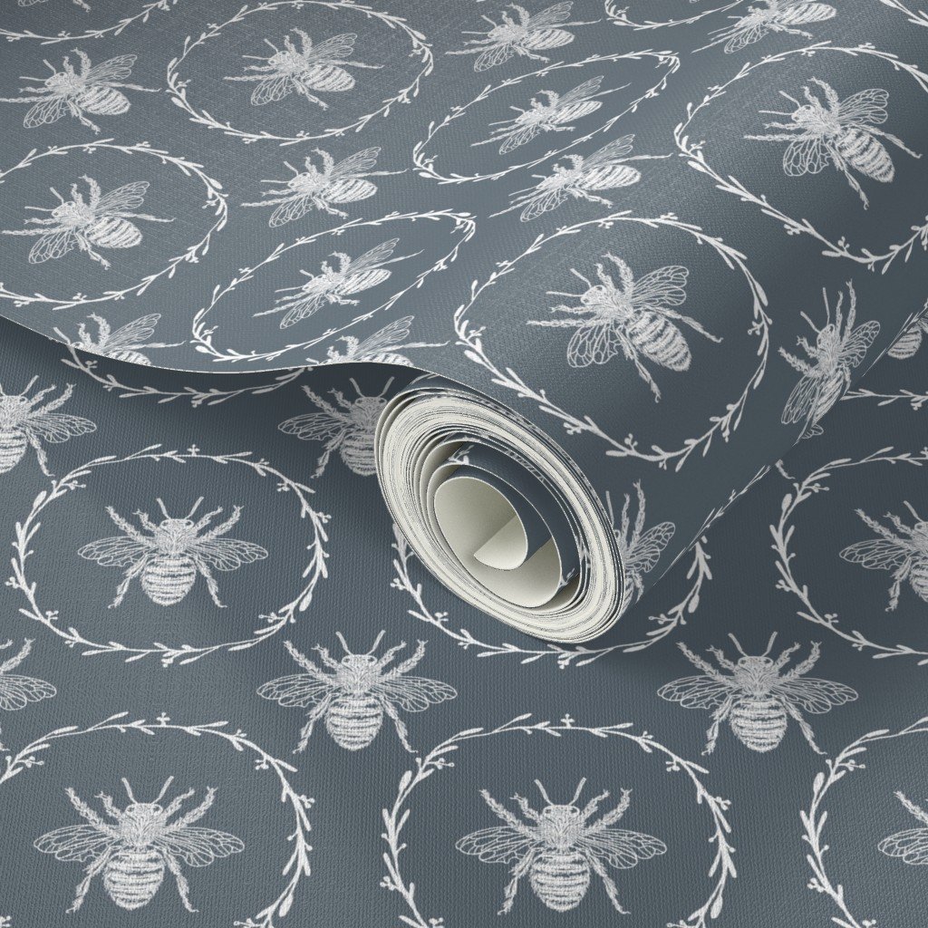 Monochrome small white bees encircled in a laurel wreath are repeated in a uniform pattern in vintage French Provincial style on ice blue.