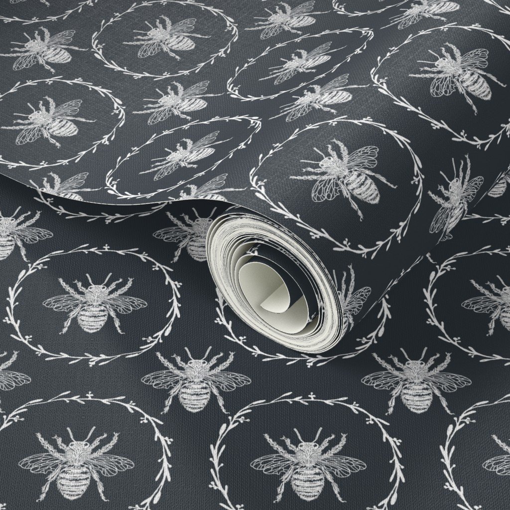 Monochrome small white bees encircled in a laurel wreath are repeated in a uniform pattern in vintage French Provincial style on twilight blue.