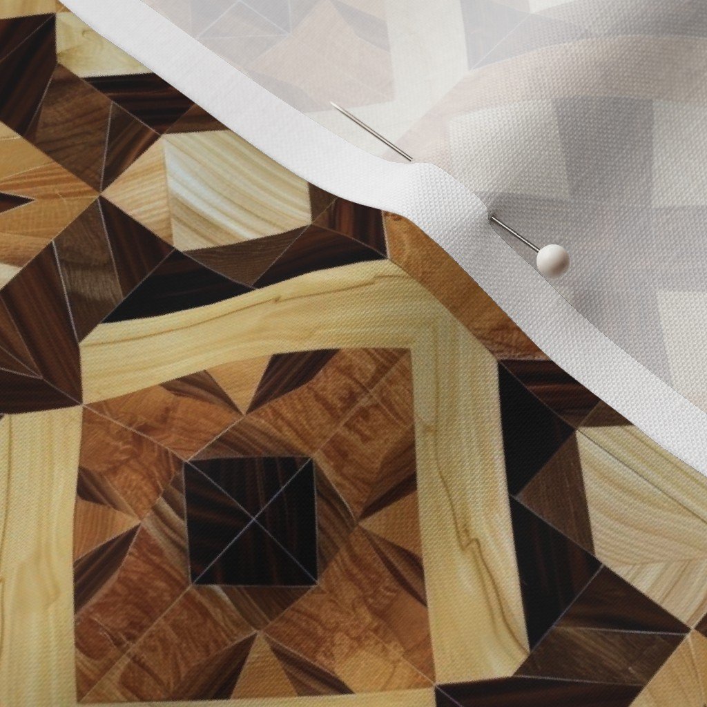 This marquetry-inspired geometric wood pattern showcases a bold parquet layout with deeper contrasting tones. Drawing from historic European craftsmanship, the structured symmetry and layered wood effect suit sophisticated fabric and décor applications.
