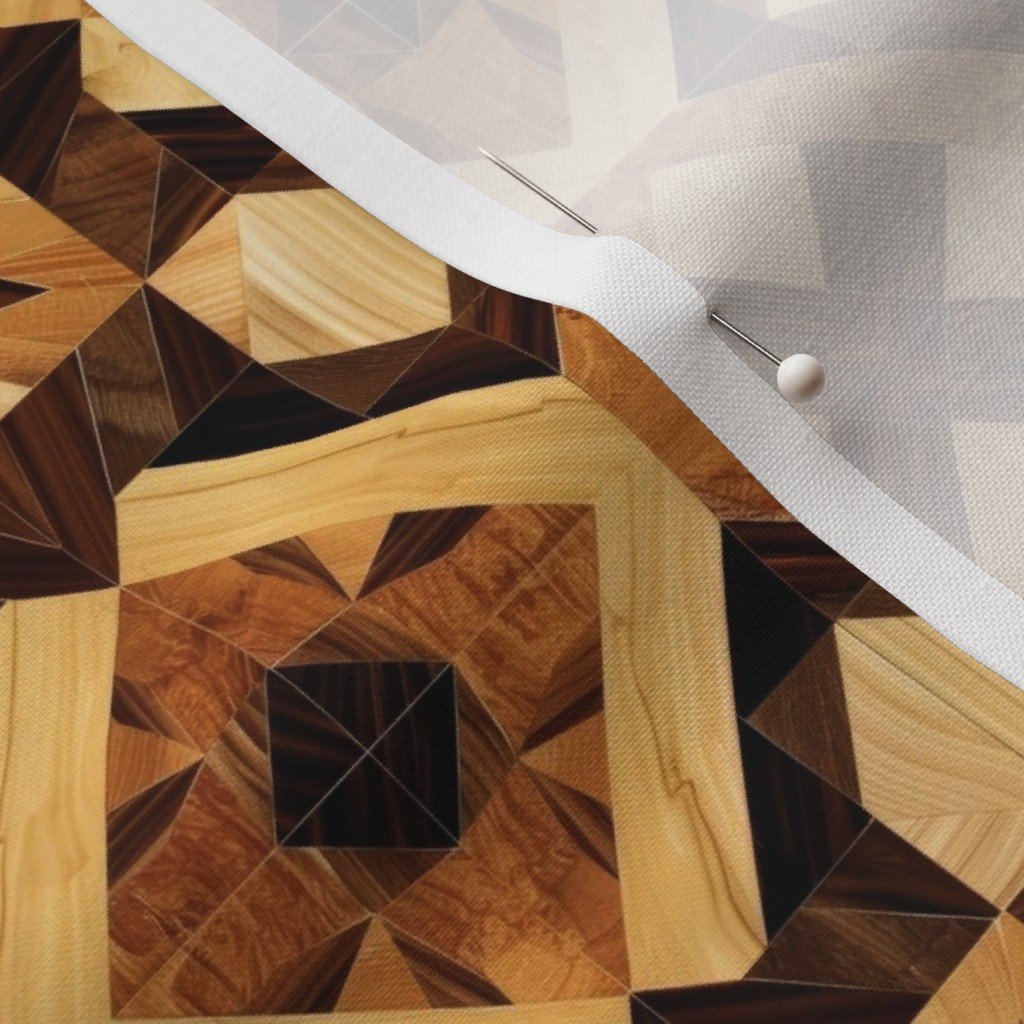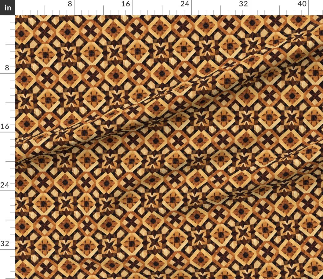 This geometric marquetry wood inlay pattern features a repeating parquet-style design inspired by traditional European cabinetmaking. Warm natural wood tones create depth and symmetry, making it well suited for fabric, home décor, and interior design