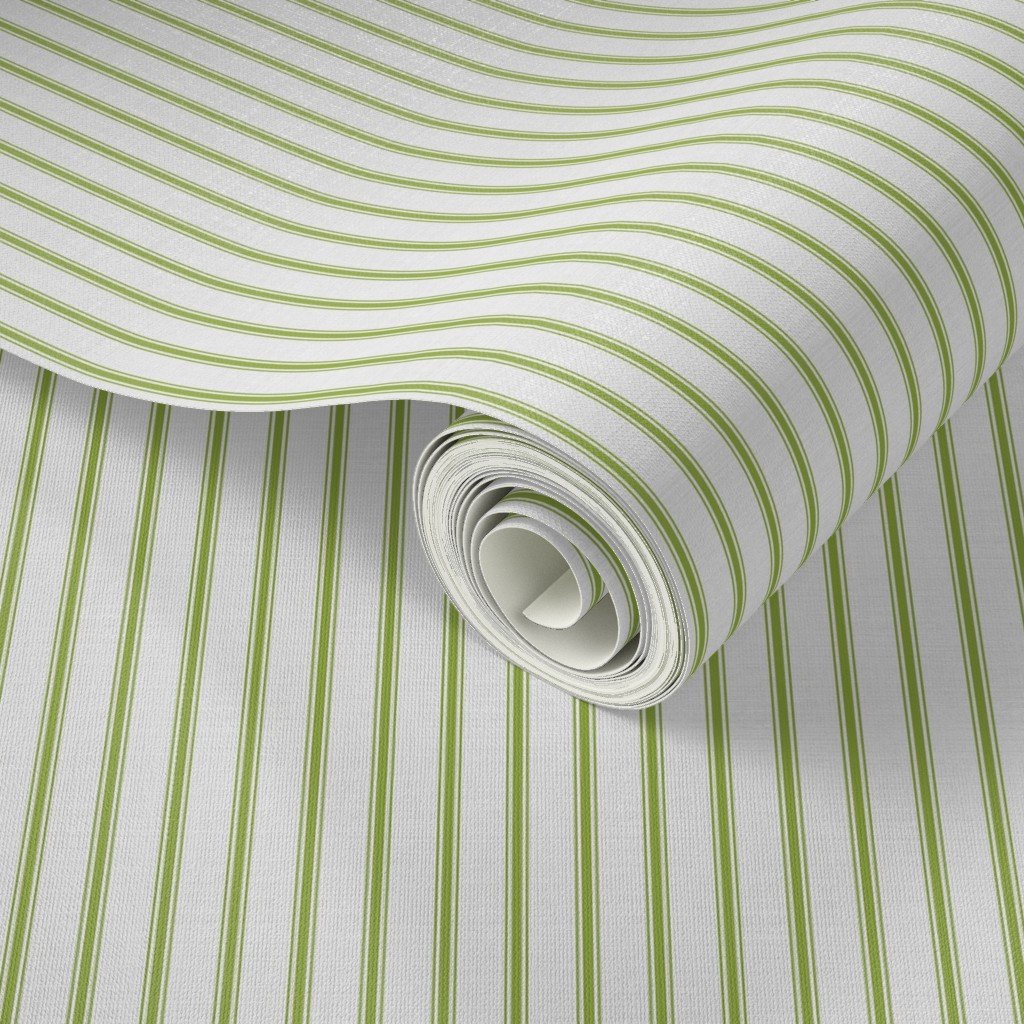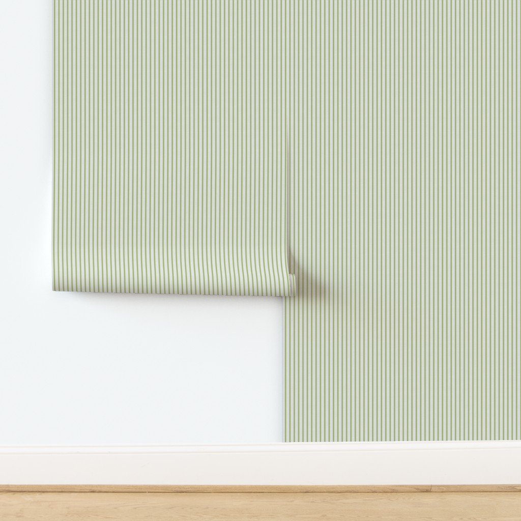 Stitched and woven straight vertical lines of one grass green stripe either side of a small stripe in off-white are seen in French provincial