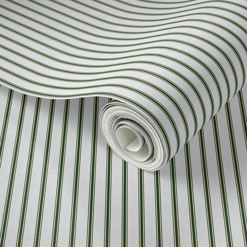 Stitched and woven straight vertical lines of one lichen green stripe either side of a small stripe in off-white are seen in French provincial