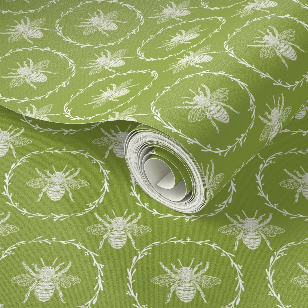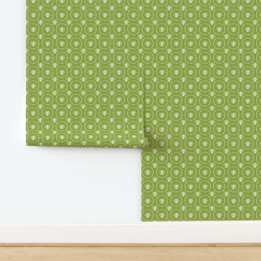 Monochrome small white bees encircled in a laurel wreath are repeated in a uniform pattern in vintage French Provincial style on Grass Green.