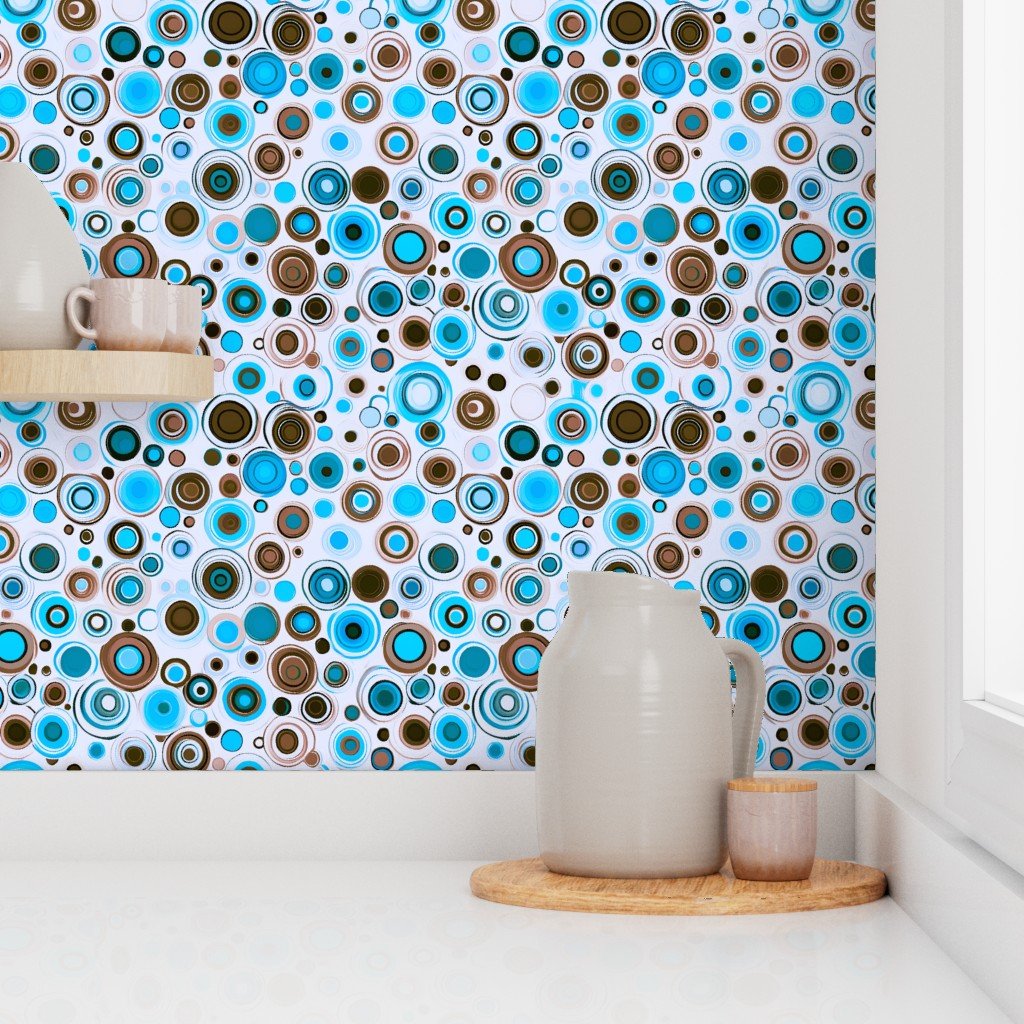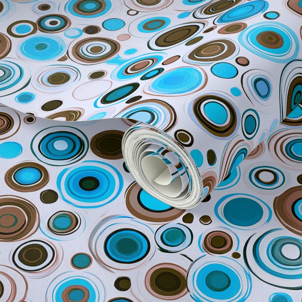 A playful abstract design featuring concentric circles in blue and brown on a light background.