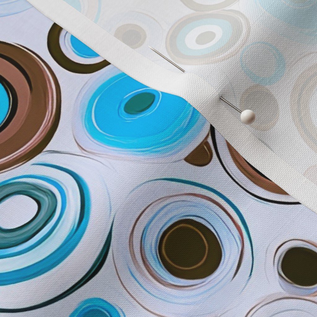 A playful abstract design featuring concentric circles in blue and brown on a light background.