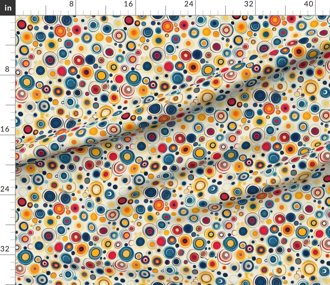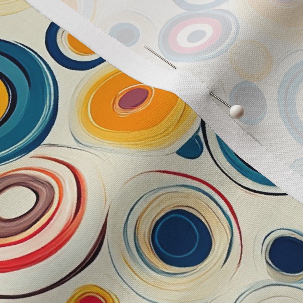 A bold abstract design featuring vibrant blue and yellow concentric circles set against a light background. SpecificationsFabric content: 100% CottonPrinted width: 42 inchesWeight: 4.4 oz/yd²Opacity: OpaqueConstruction: Plain WeaveShrinkage: 5-6% length x 2-3% widthThread count: 120Performance RatingsWyzenbeek (cotton duck abradant): 30,000 double rubs (ASTM D1457-13)Martindale: 20,000 cycles (ASTM 4966-22)Crocking dry (1 severe – 5 no color transfer): Exceeds 3 (AATCC TM 8)Crocking wet (1 severe – 5 no color transfer): Exceeds 3.5 (AATCC TM 8)Pilling (1 severe – 5 none): 4.5Note or Country of OriginCountry: Woven in IndonesiaPrinting: Digitally printed in the USA with water-based inksFabric backing: The backside of the fabric will be unprinted