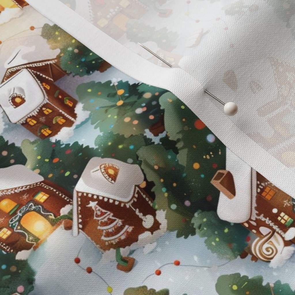 This enchanting pattern captures a snowy gingerbread village illuminated by festive lights, with beautifully decorated Christmas trees
