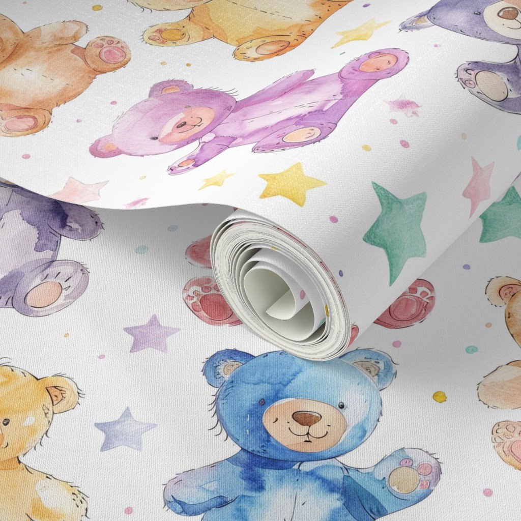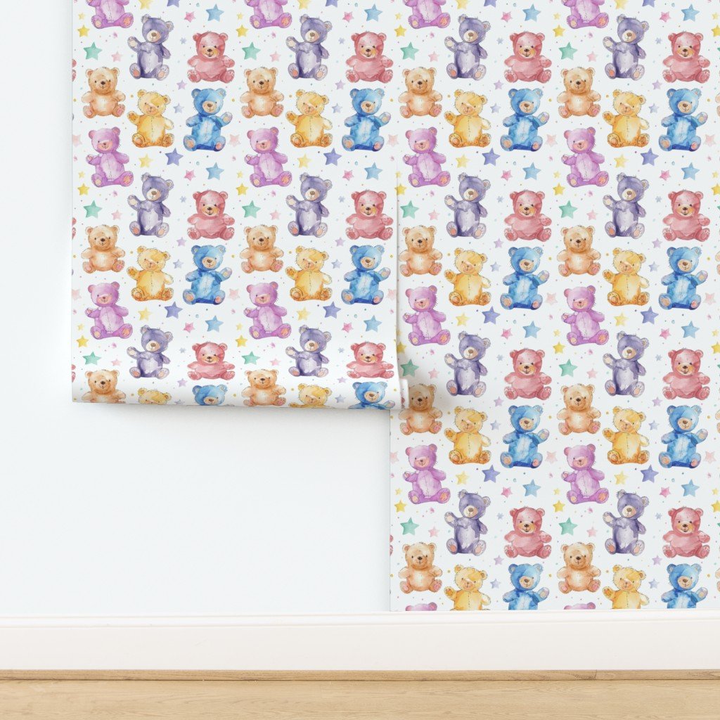 Soft pastel blue, pink, mint and lilac small teddy bear prints interspersed with stars and dots